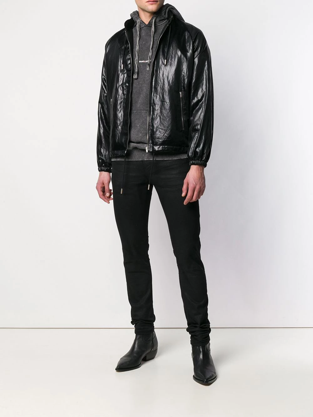 With every new season collection, Saint Laurent continues to reference the rich archive of founder Yves Saint Laurent. This black concealed hood jacket features a front zip fastening, long sleeves, elasticated cuffs, side zipped pockets and a drawstring hem.