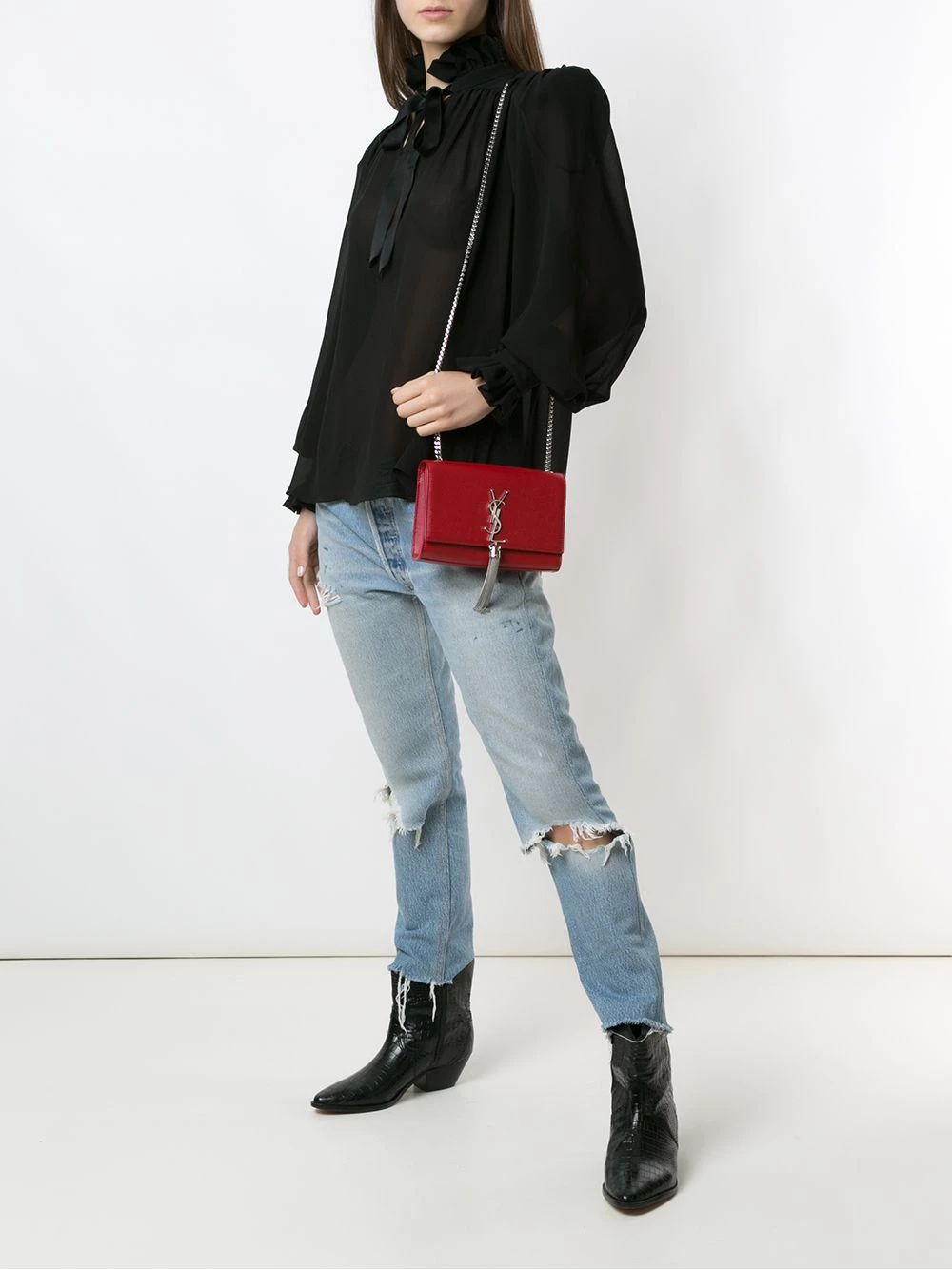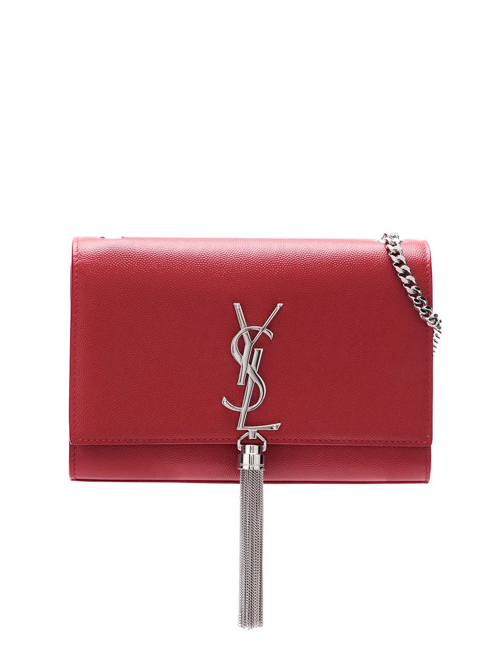 Red Kate leather bag from Saint Laurent featuring a silver-tone chain shoulder strap, a foldover top with magnetic closure, a structured design and an internal patch pocket.
