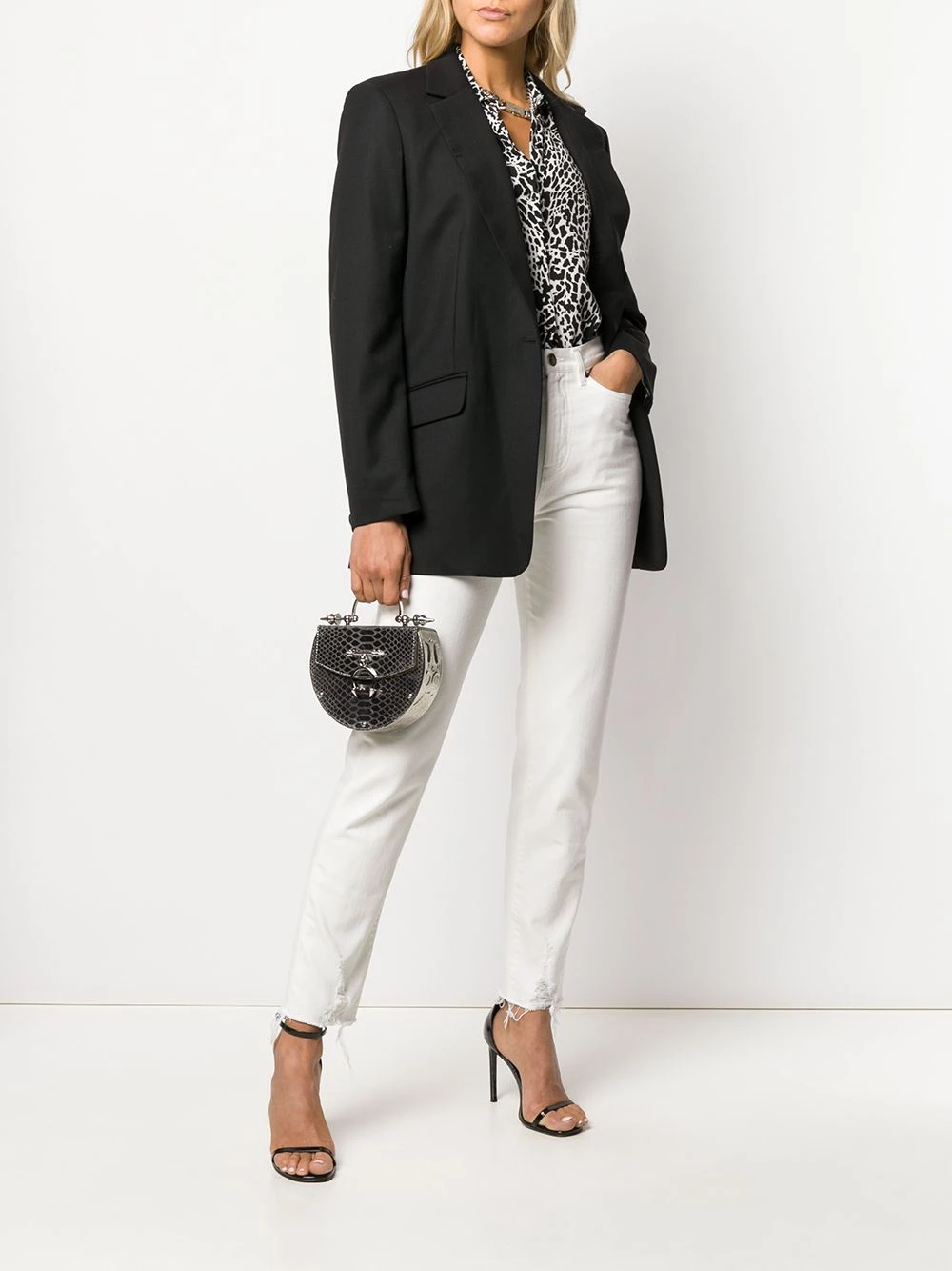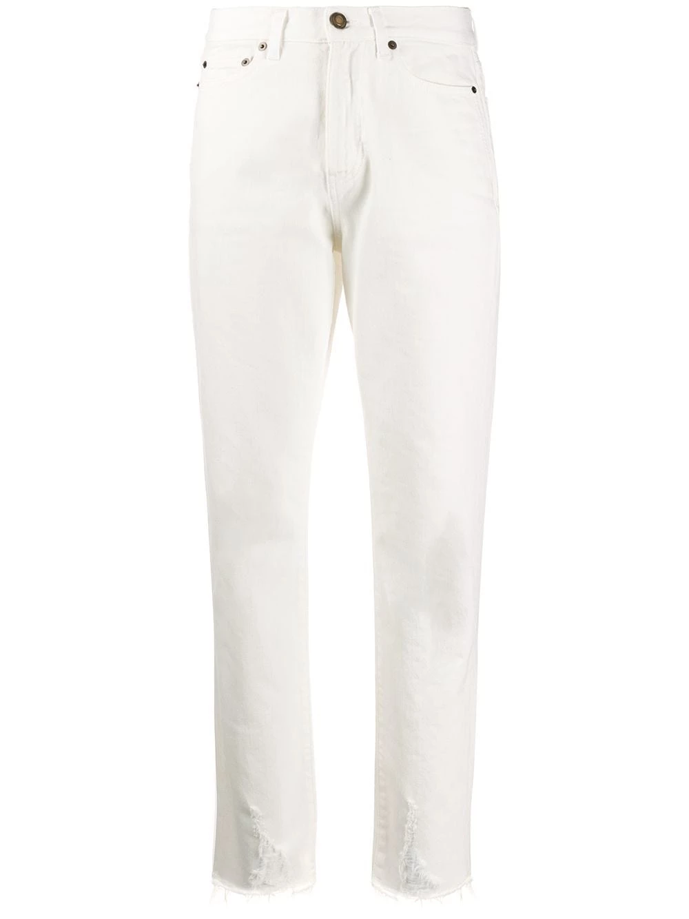 From work to weekend and beyond, these Saint Laurent’s white cotton raw-edge straight leg jeans will look incredibly good on any occasion. Comfortable, versatile, and super stylish. But, please, be careful with sangria! Featuring a mid-rise, a button and zip fly, a waistband with belt loops, a five pocket design, a slim fit and raw edges.