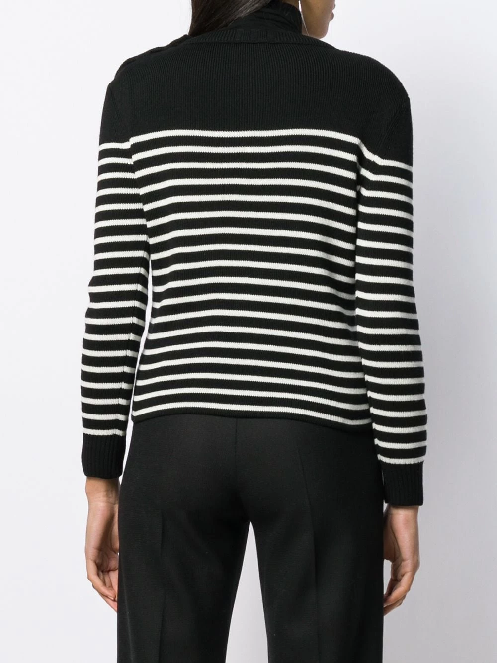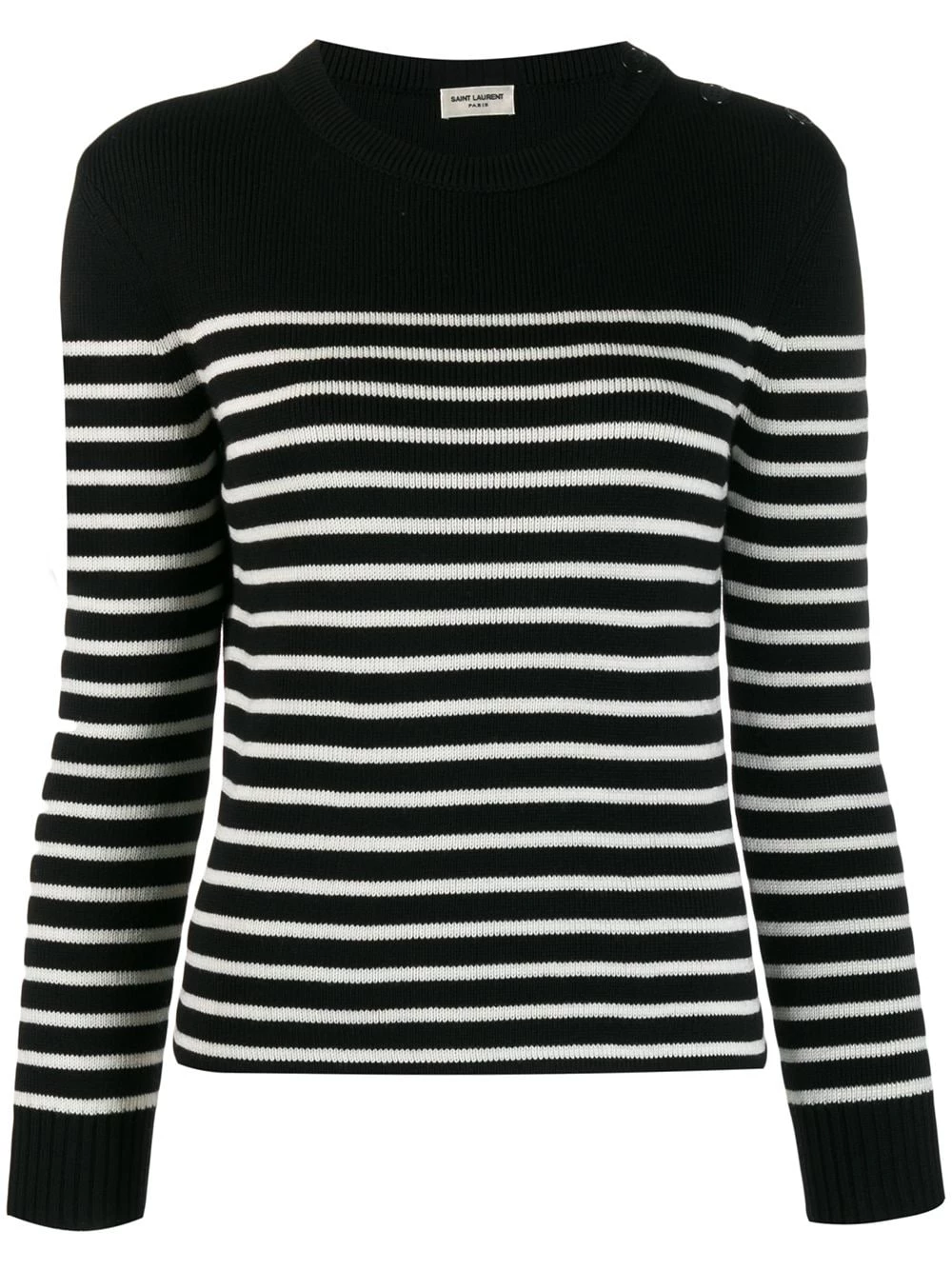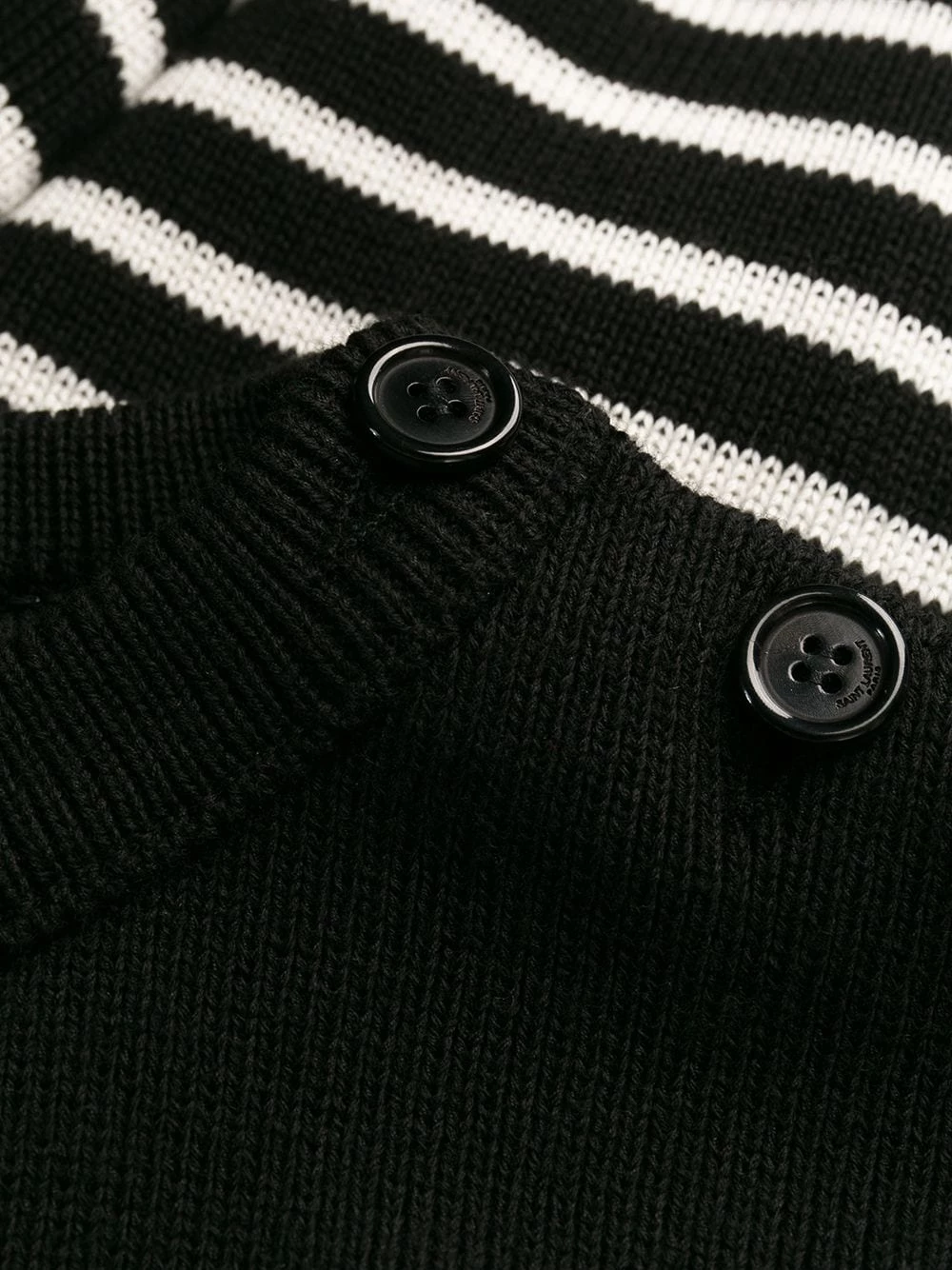Founded in 1961 by innovative designer Yves Saint Laurent, French luxury fashion house Saint Laurent fuses expert craftsmanship with the label’s signature rock ‘n’ roll flair. This black and white cotton and wool-blend striped knitted jumper features a round neck, button fastenings at the shoulder and long sleeves.