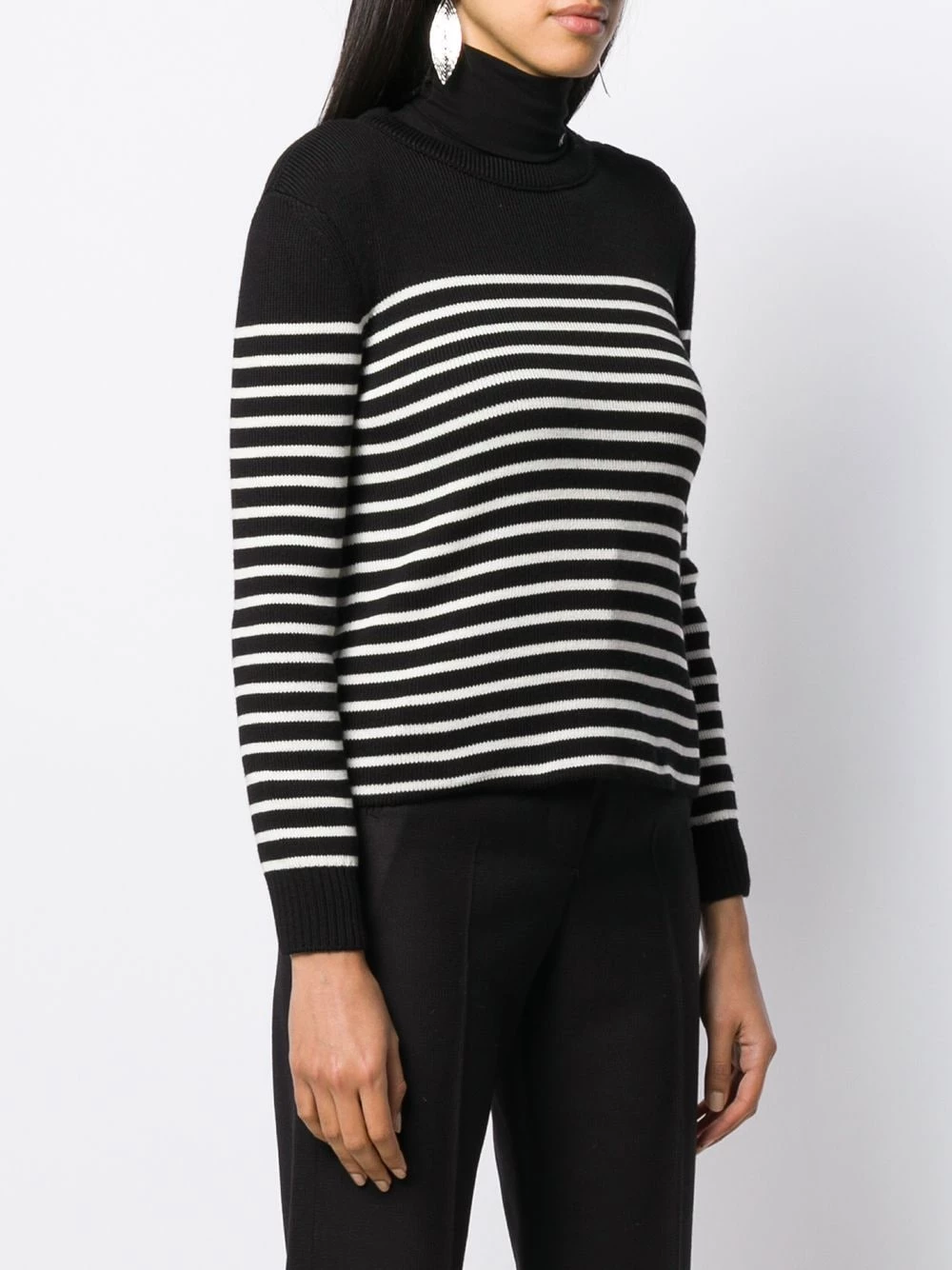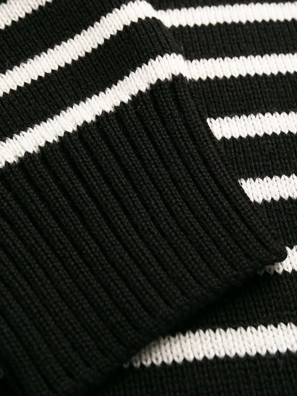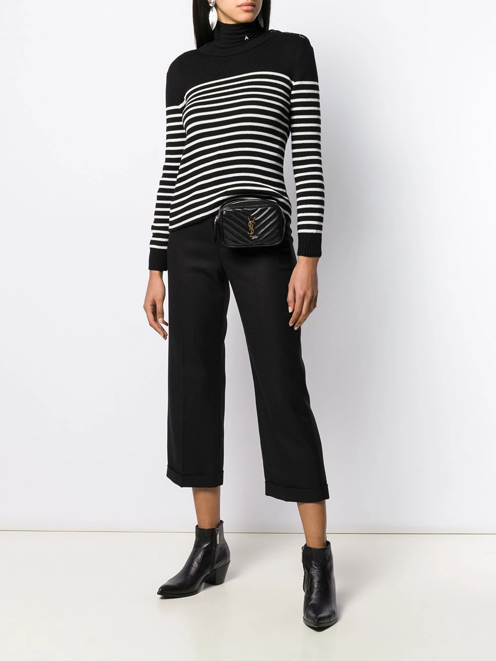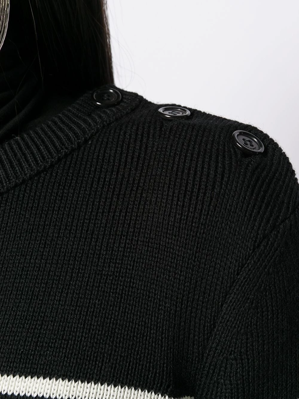 Founded in 1961 by innovative designer Yves Saint Laurent, French luxury fashion house Saint Laurent fuses expert craftsmanship with the label’s signature rock ‘n’ roll flair. This black and white cotton and wool-blend striped knitted jumper features a round neck, button fastenings at the shoulder and long sleeves.