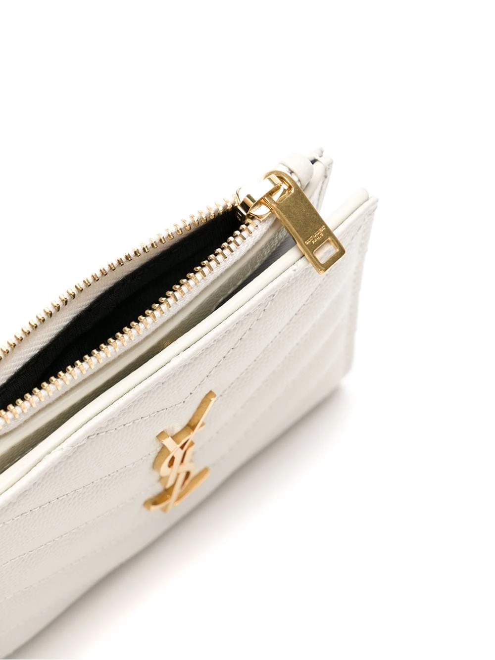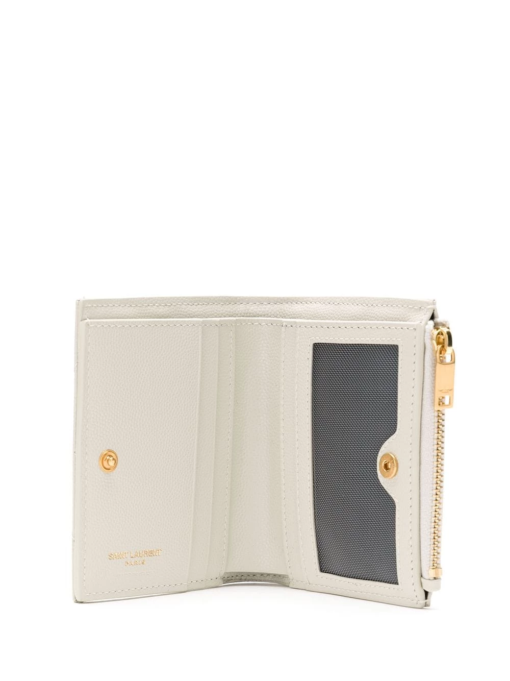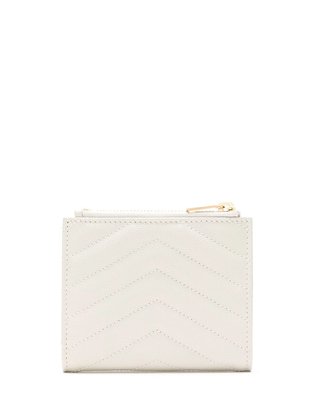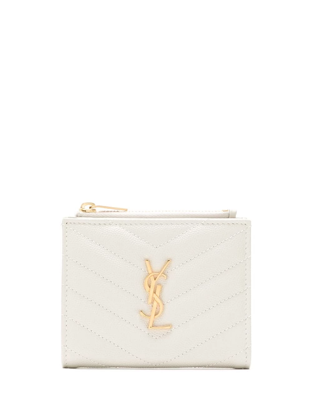 Simplicity often takes us a long way. Crafted from soft white calf leather, this YSL V-stitch wallet has a classic YSL logo plaque on the front. Less if more. Featuring gold-tone hardware, an internal logo stamp, a front logo plaque, a billfold compartment, multiple interior card slots, front zipped pockets, a V stitch pattern and a bi-fold style with a snap fastening.
