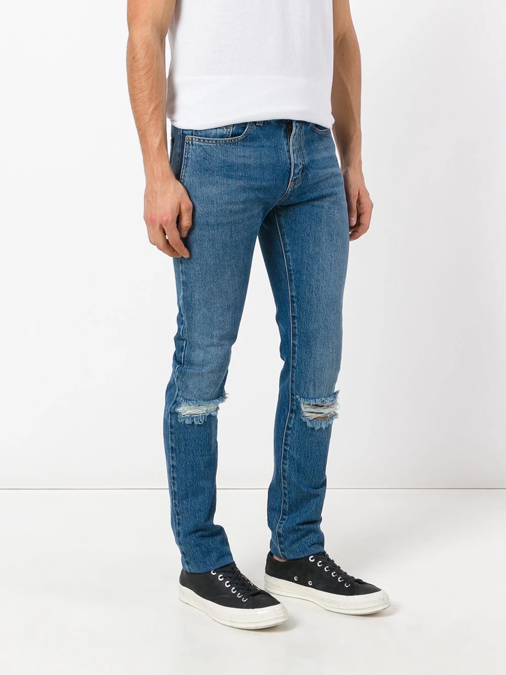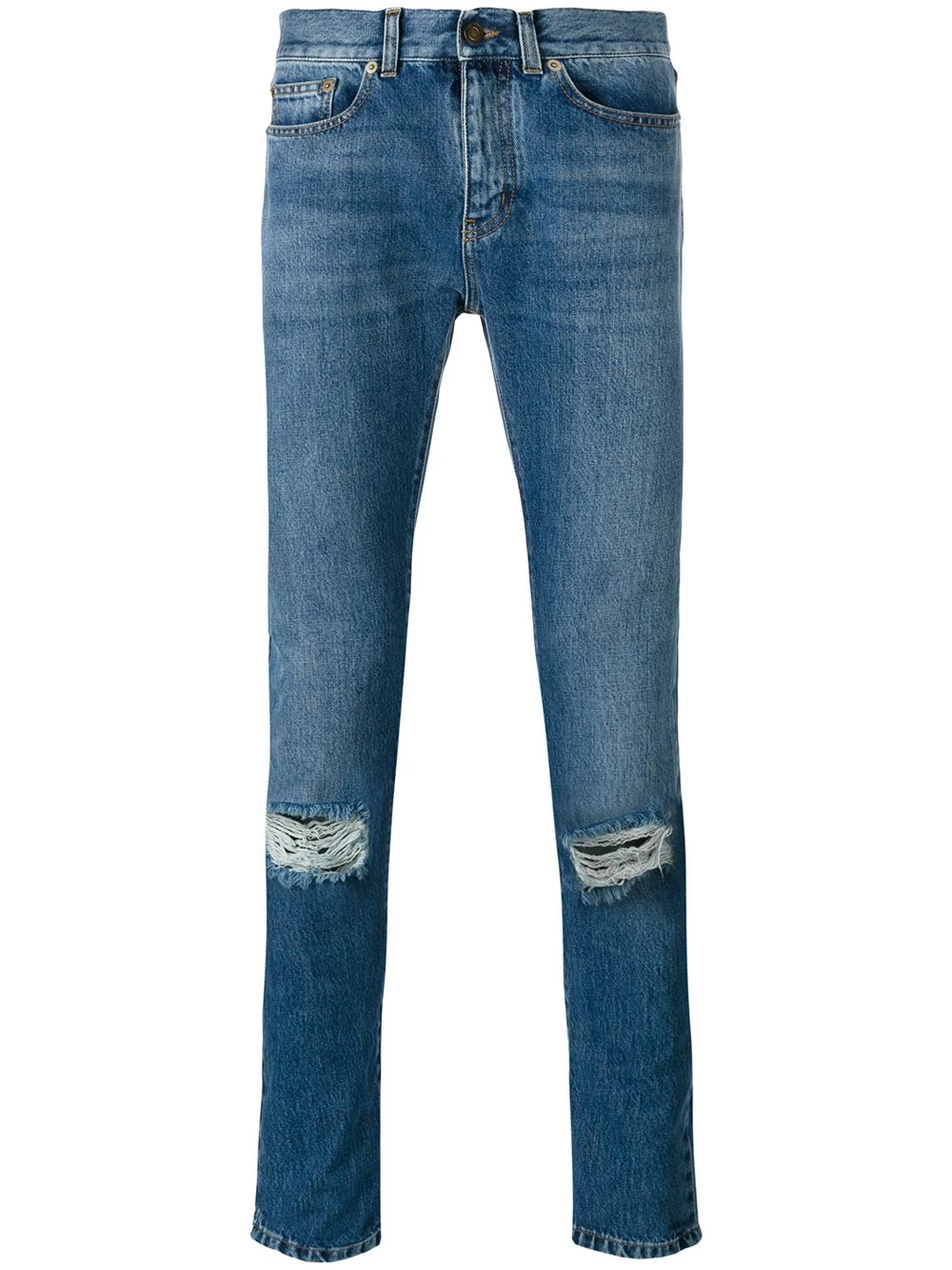 Classic in silhouette and style, Saint Laurent’s jeans are must-have for any well-edited closet. This pair is crafted from medium-wash denim that complements any wardrobe palette and cut for a slim fit. It’s finished with distressed knees for added cool.