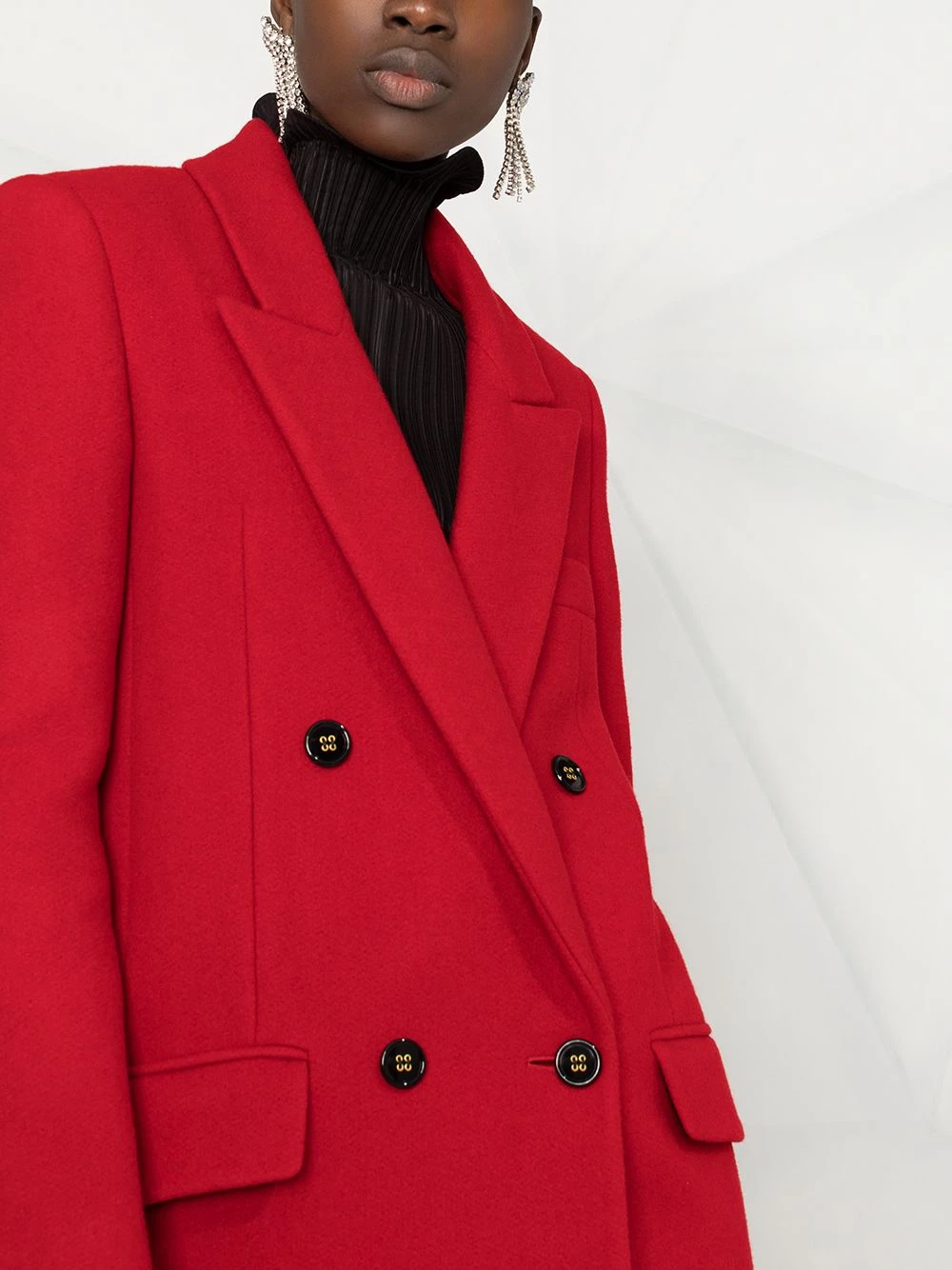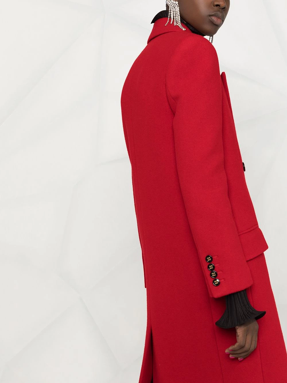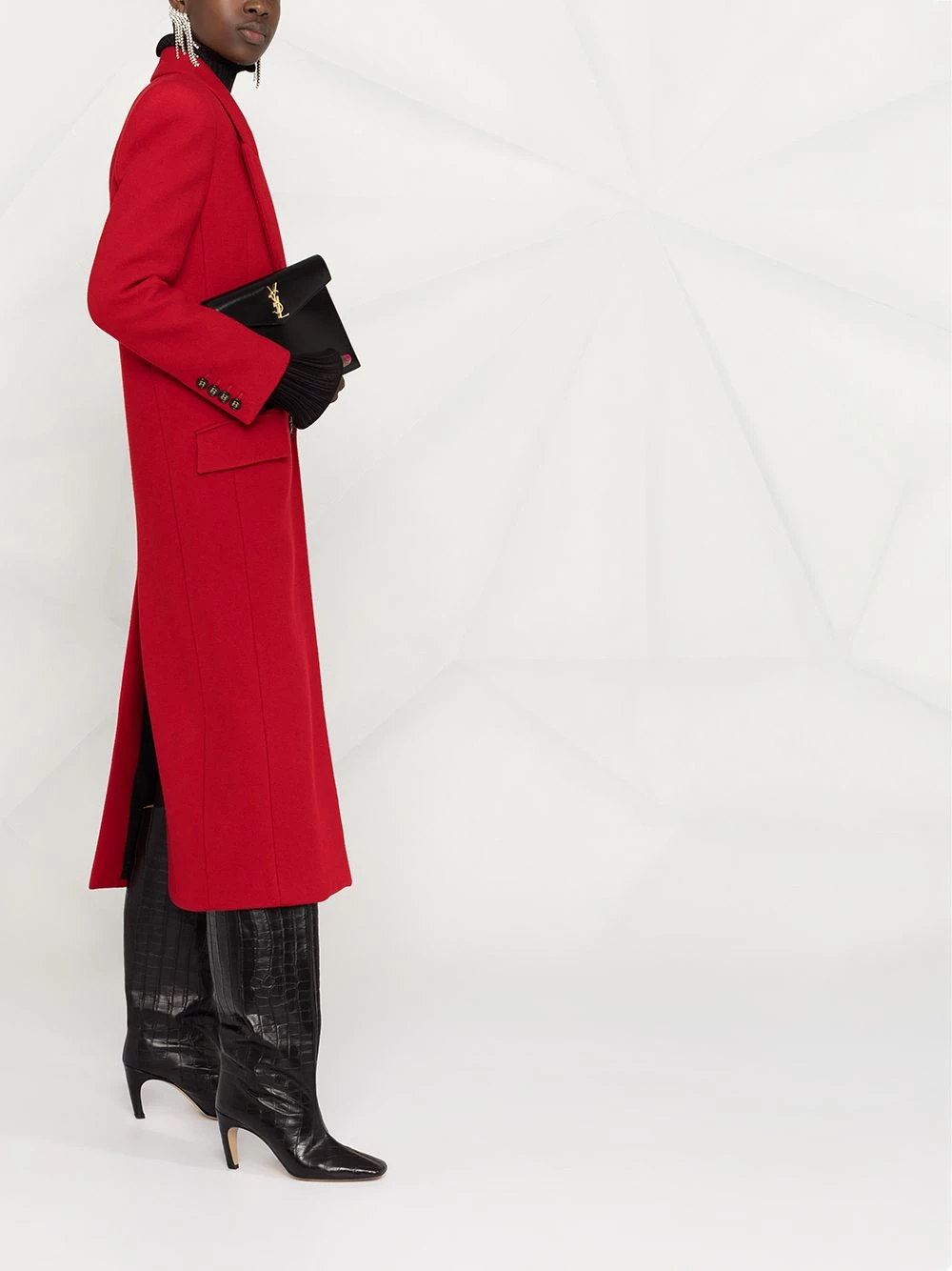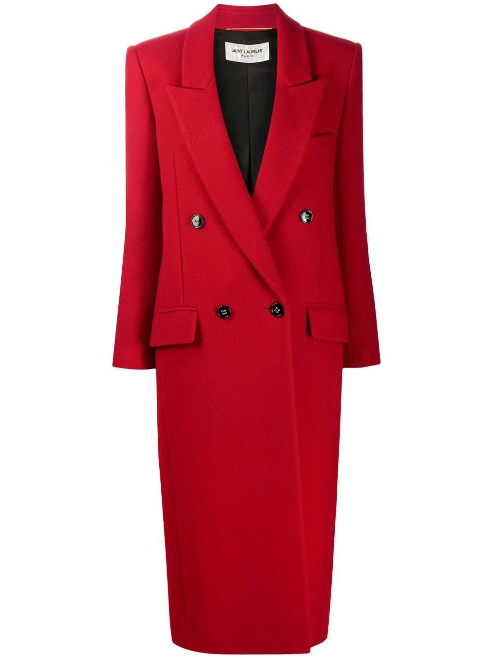 Paint the town in this bold red coat. The cold can’t stop you in this sleek Saint Laurent design. Button up.