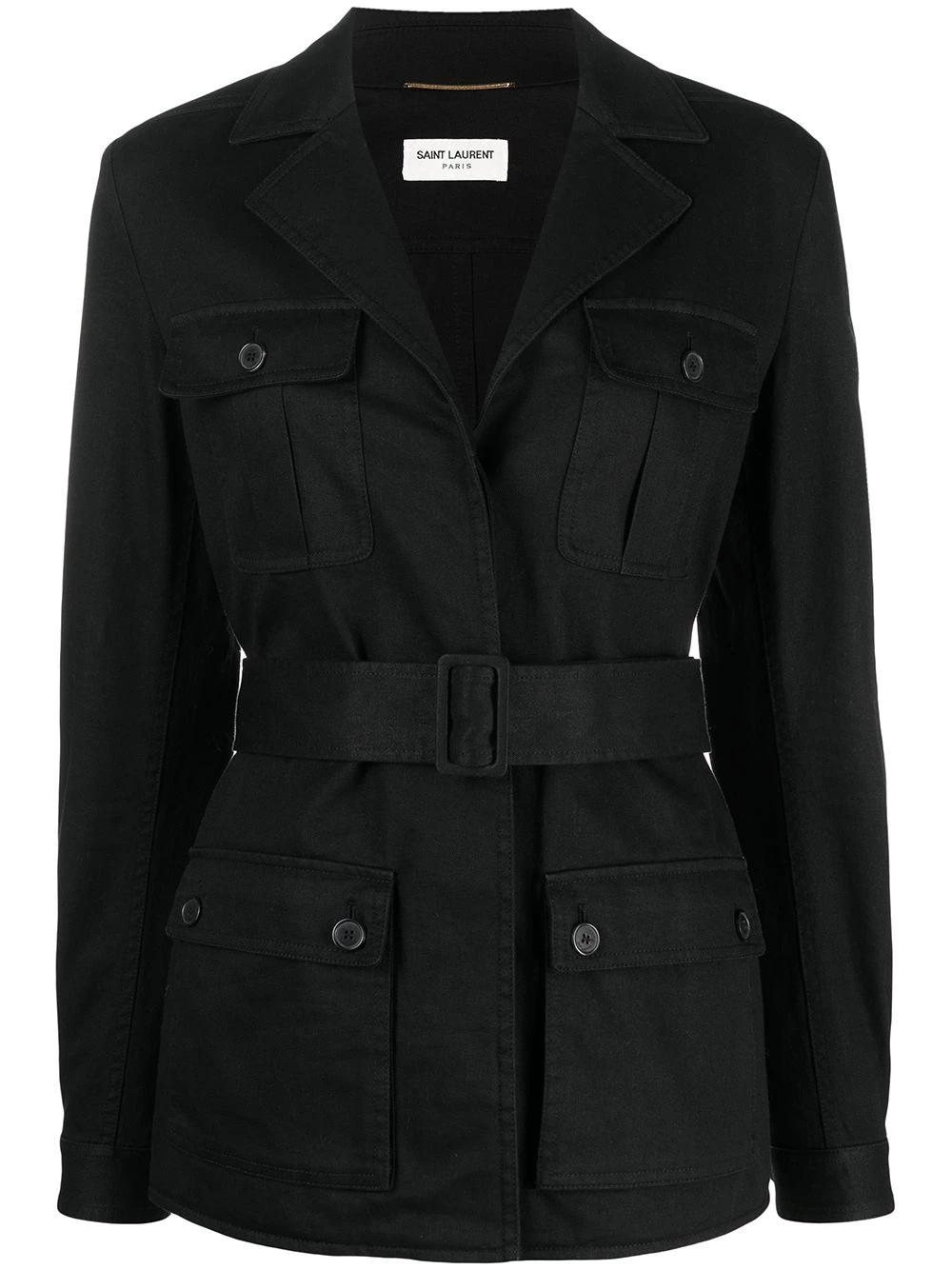 The perfect best-of-both-worlds jacket. Lightweight and practical, yet tailored and feminine, this belted flap pocket jacket from Saint Laurent will have you comforted and ready to go. A true multi-tasker.