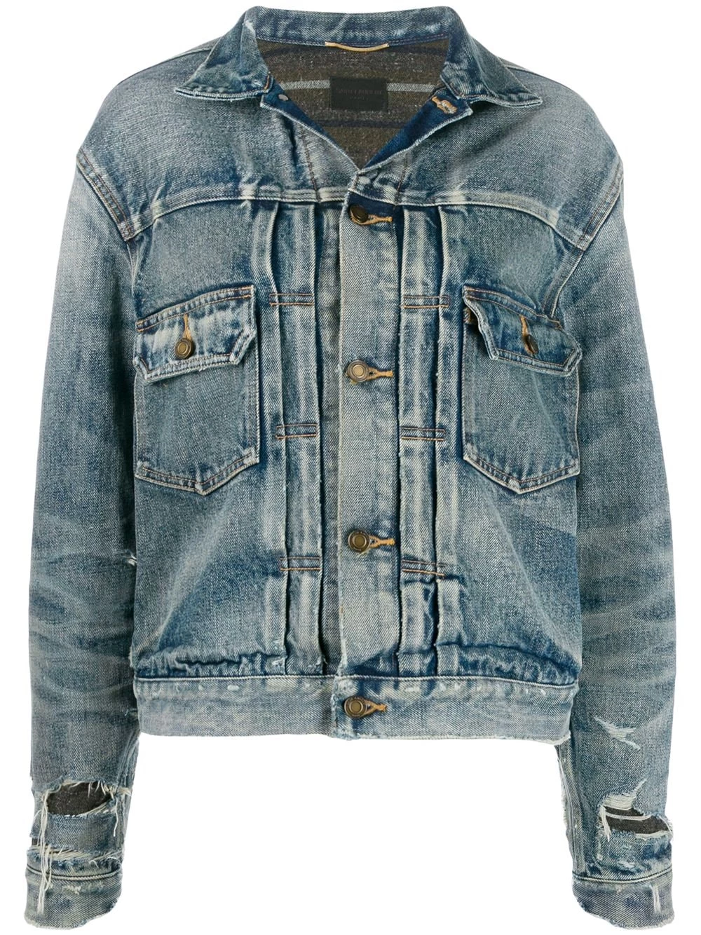 Distressed but ready to impress! This blue cotton destroyed denim jacket from Saint Laurent is one way of looking at your clothes with a new perspective, perfect doesn’t necessarily mean pristine. It features a classic collar, a front button fastening, long sleeves, two chest pockets and distressed effects.