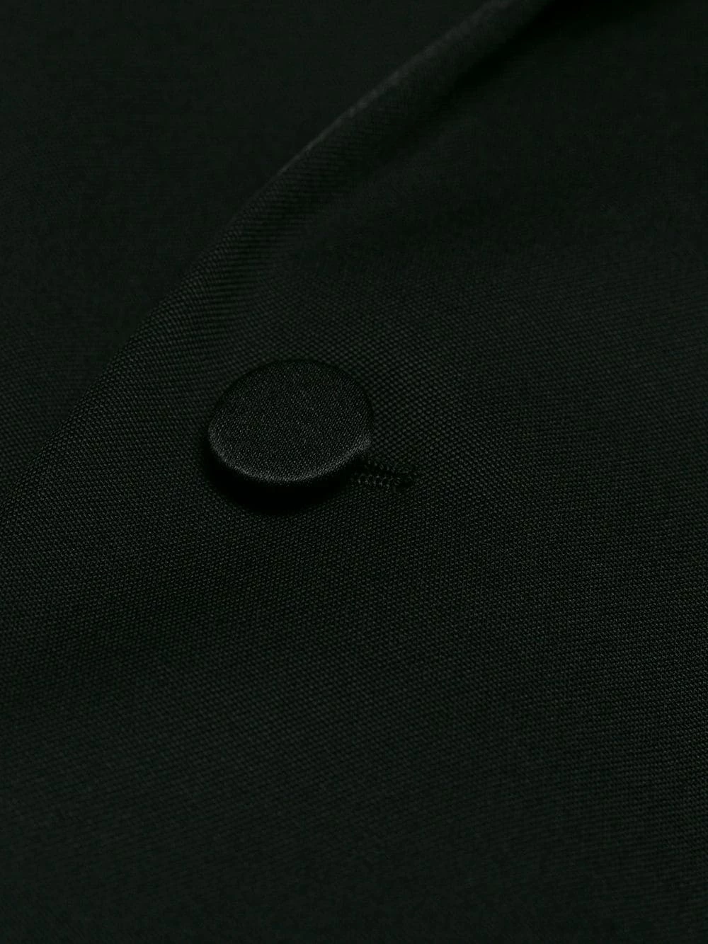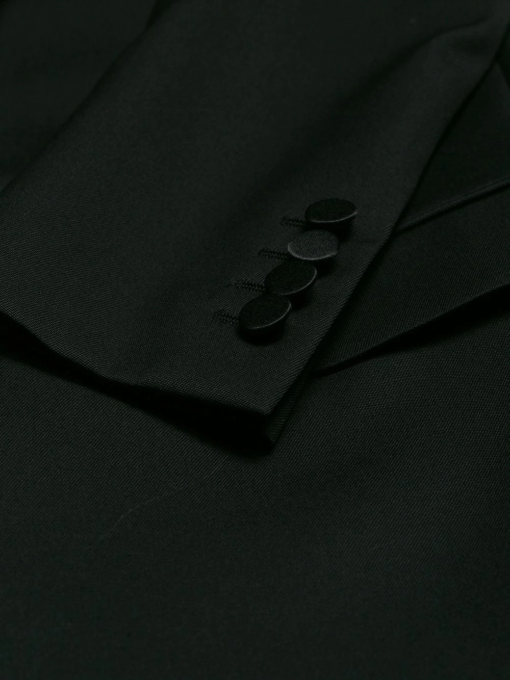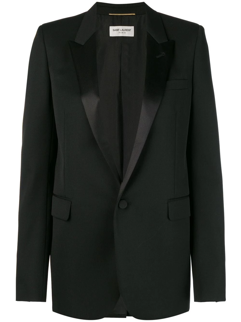 Walk into the office in style and grace with this black Giacca smoking jacket from Saint Laurent. Designed with a deep v-neck, this piece will guarantee an elegant vibe anytime. Now, go. You’re the boss! Featuring peaked lapels, a front button fastening, flap pockets and a rear central vent.