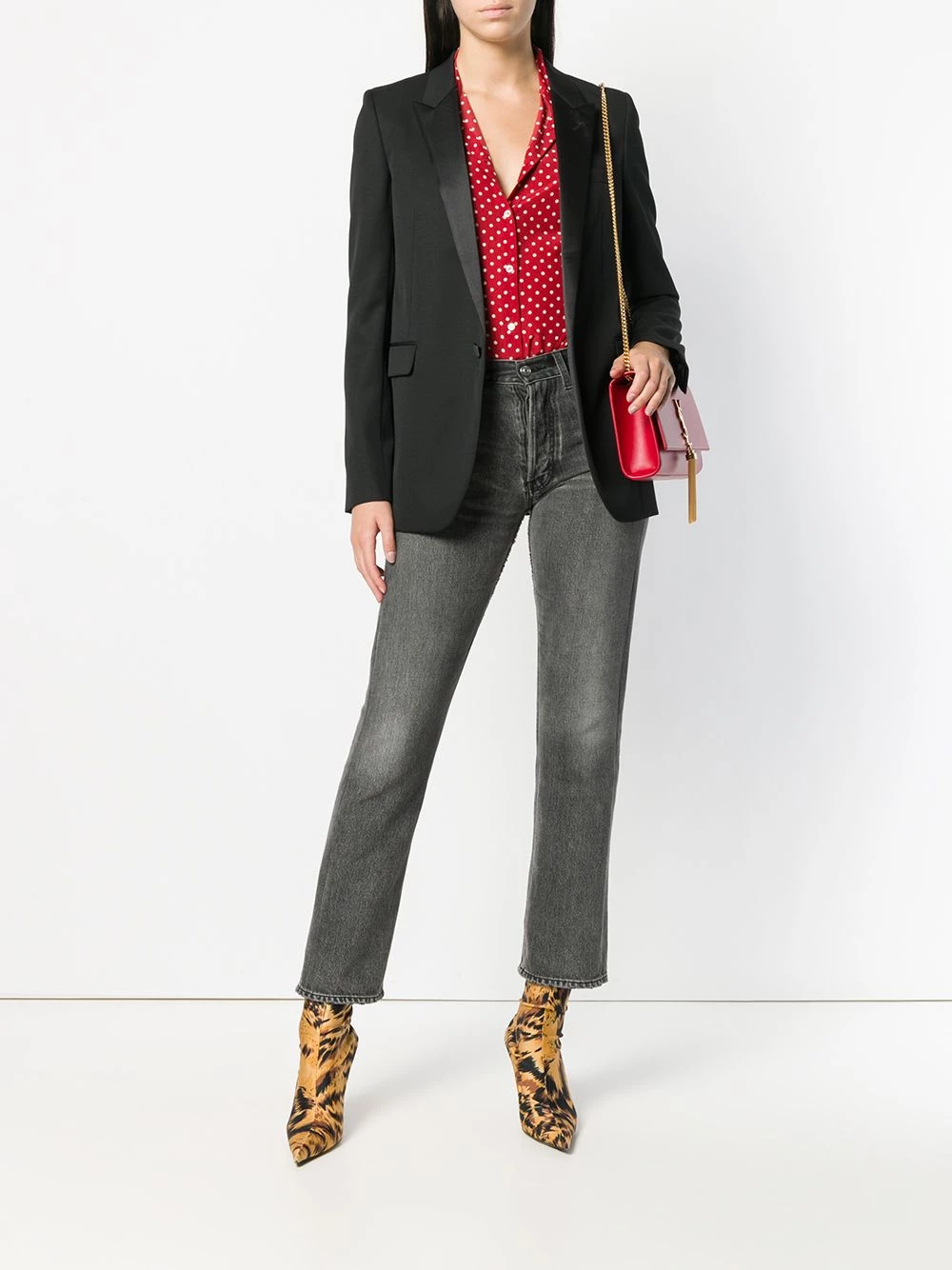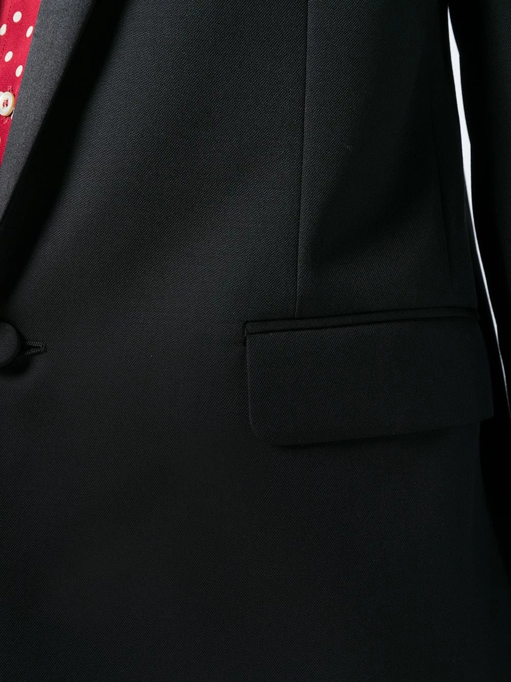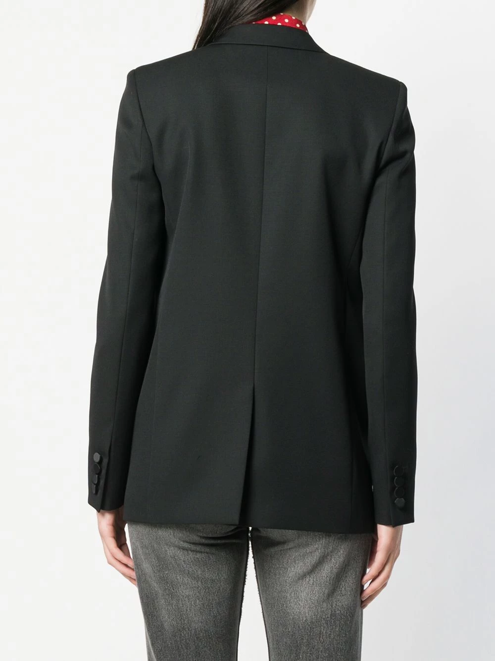 Walk into the office in style and grace with this black Giacca smoking jacket from Saint Laurent. Designed with a deep v-neck, this piece will guarantee an elegant vibe anytime. Now, go. You’re the boss! Featuring peaked lapels, a front button fastening, flap pockets and a rear central vent.