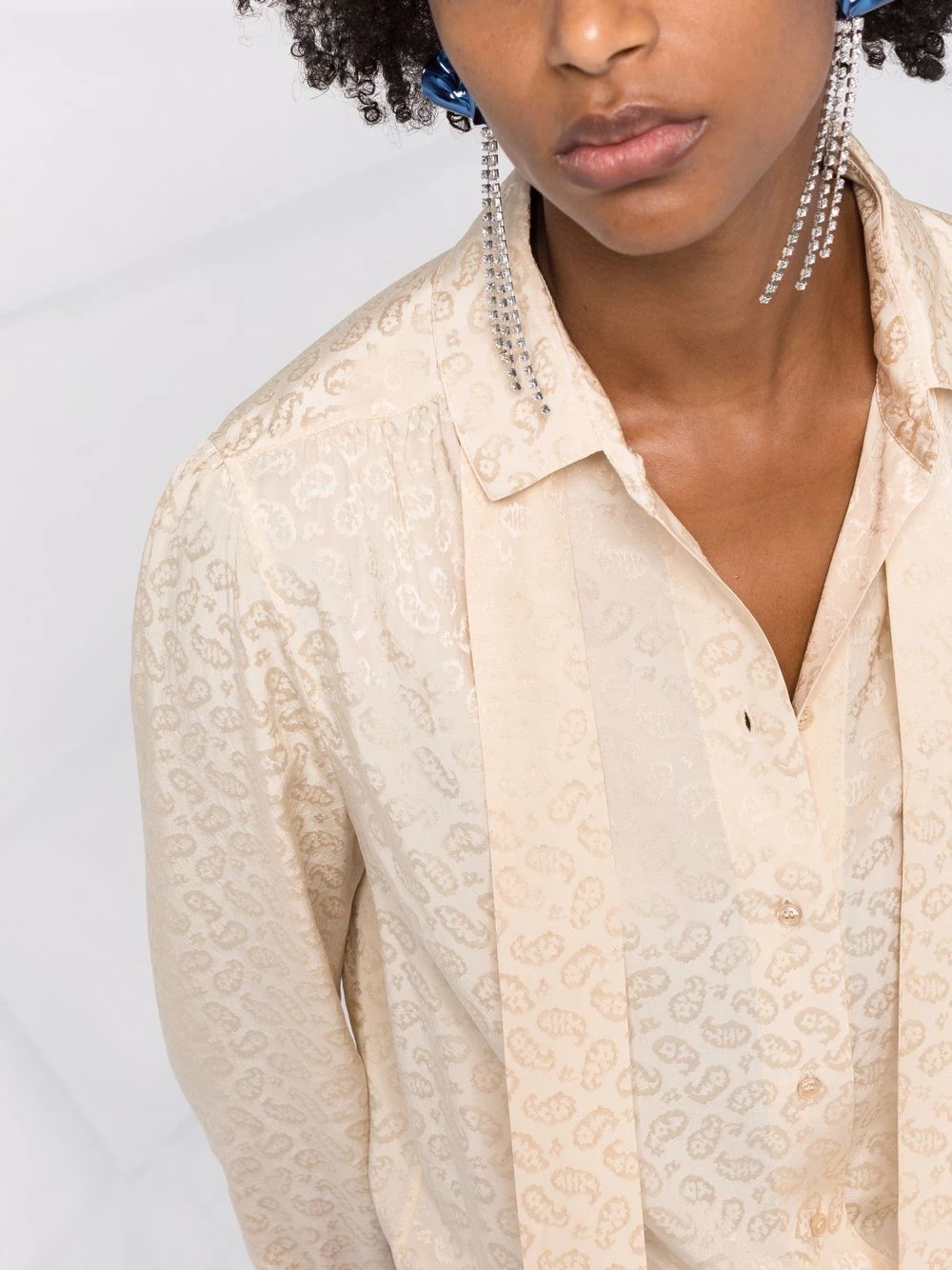 Saint Laurent presents feminine elegance in the form of this silk pussybow shirt. This long-sleeved piece is subtly elevated by the tonal paisley jacquard and gathered detailing at each shoulder.