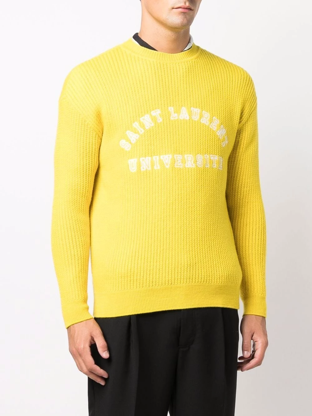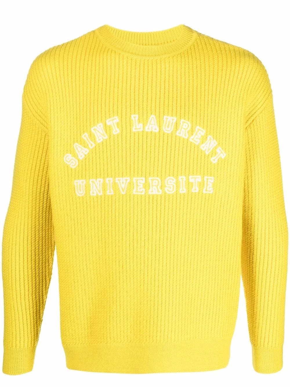 In a sunny yellow hue, this wool blend sweater is embroidered with Saint Laurent’s Université logo to the chest. Exhibiting a crew neck collar, drop shoulder design, long sleeves and ribbed trim, the bright jumper is knitted in a slim fit construction.