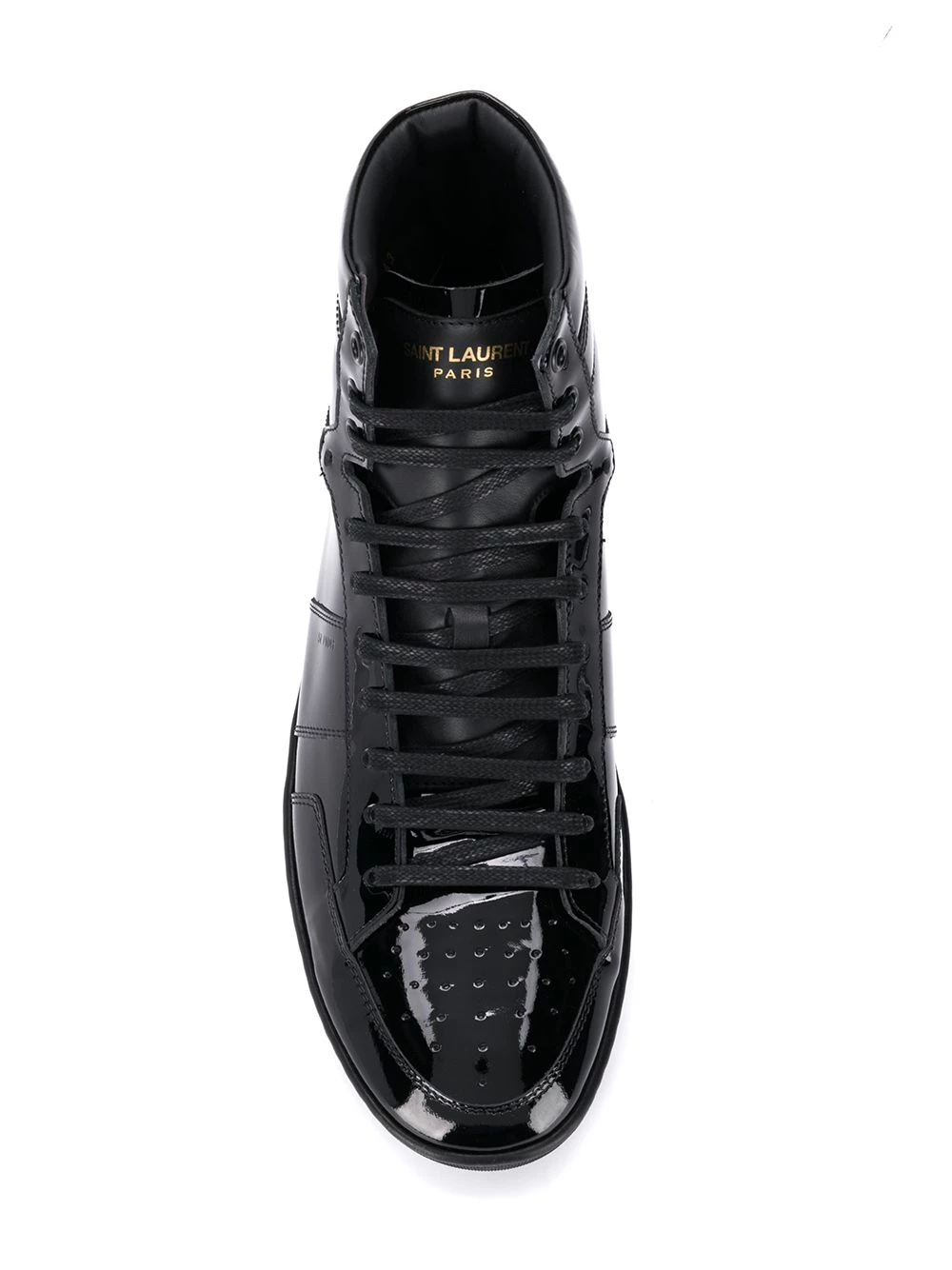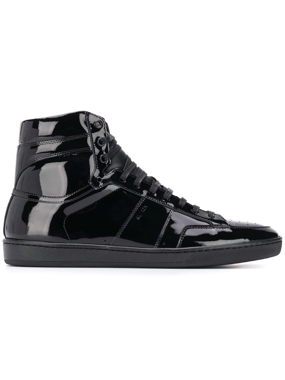 Who said that sneakers were only meant for the scruffy? Saint Laurent proves you can remain comfortable and suave in these sleek black leather varnish hi-top trainers that can take you from a lunch meeting with a client to the bar with friends. Say hello to your new versatile footwear. Featuring a lace-up front fastening, a flat rubber sole and a round toe.