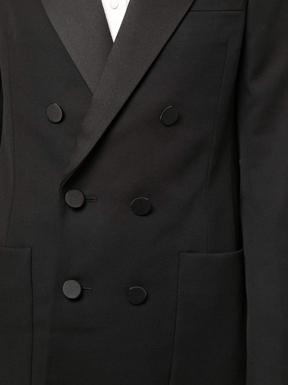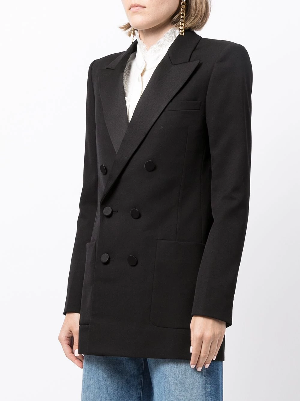 Saint Laurent showcases its ability to deliver impeccable tailoring with this double-breasted blazer. Crafted from grain de poudre wool, this piece is finished with a silk satin collar that elevates this sleek formal design.