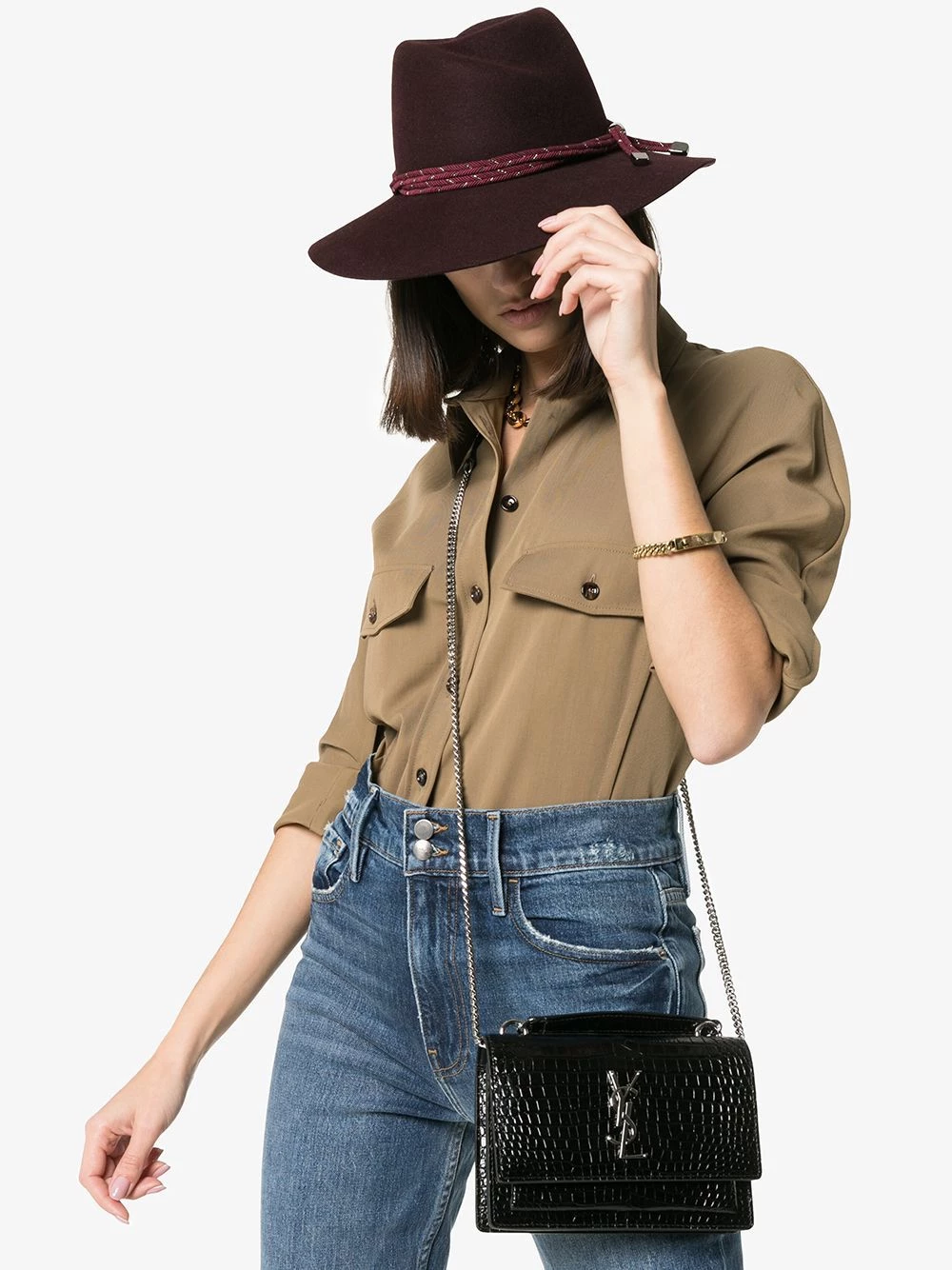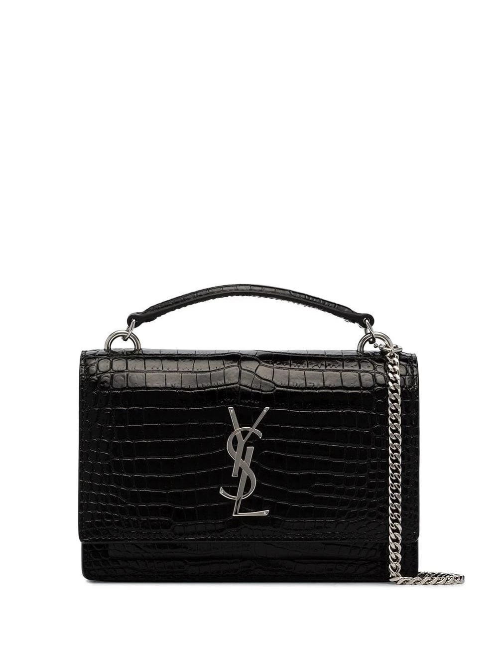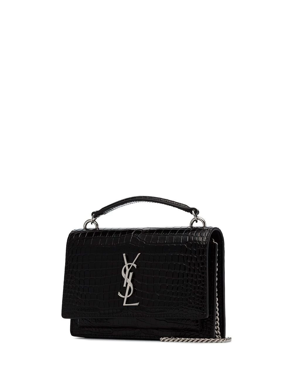 Didn’t you know that a lady’s outfit is never complete without an elegant bag? Carry your daily essentials inside this black leather Sunset top handle bag from Saint Laurent that has a striking embossed crocodile effect and beautiful silver-tone chain. Carry your look to the next level. Featuring a round top handle and a silver-tone logo plaque.