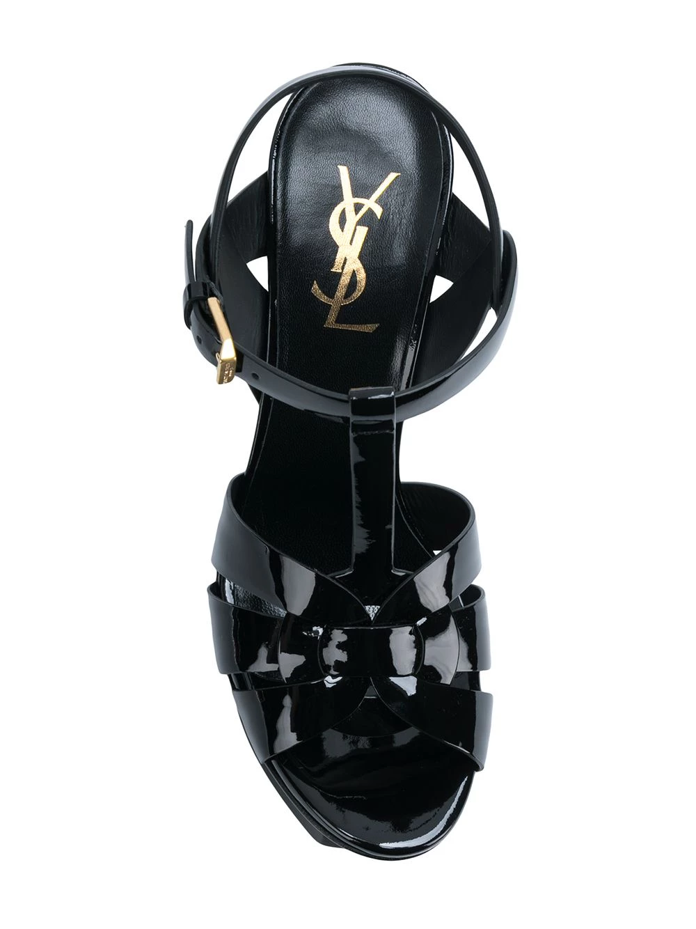 Think ‘contemptuous widow attending the funeral of her husband who died in suspicious circumstances’ – and then you are close to comprehending the drama of these Tribute sandals from Saint Laurent….close. With a strappy design balanced atop a 105mm heel, this pair was made for strutting. And remember – hell hath no fury like a woman scorned. Featuring an open toe, a gathered design, a t-strap to the front, an ankle strap with a side buckle fastening, a brand embossed insole, a platform sole and a high stiletto heel.