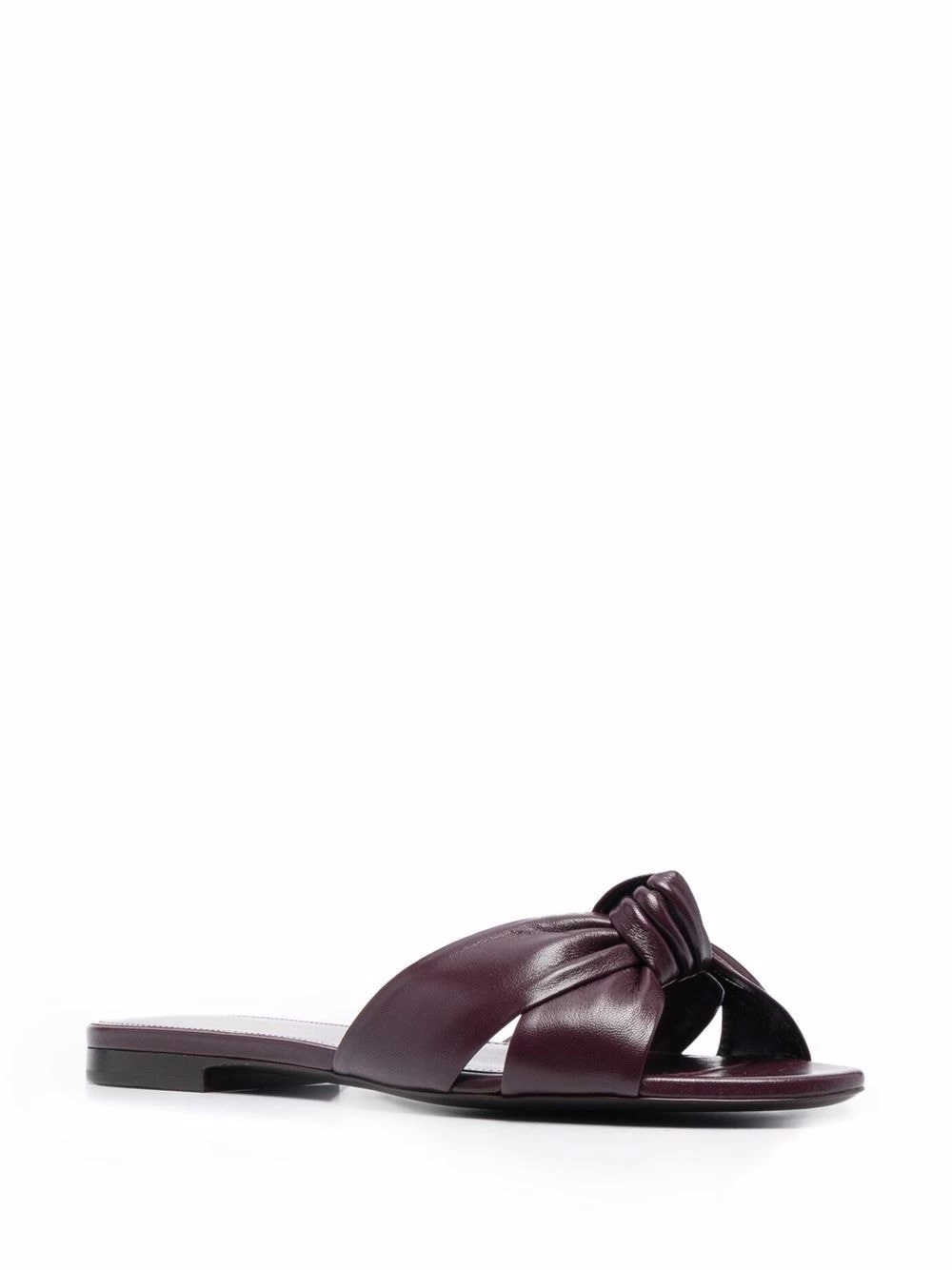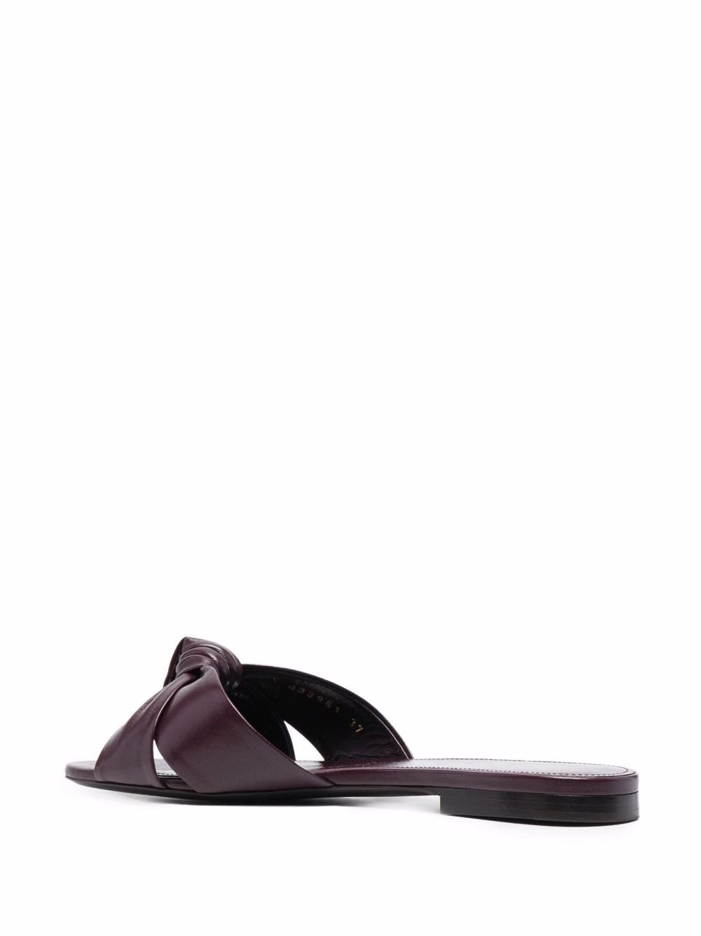 Designed with knot detailing at the front, these wine red sandals from Saint Laurent encompass the brand’s classic focus on impeccable construction. Produced in supple leather, they feature an almond toe and slip-on style for an effortless finish.