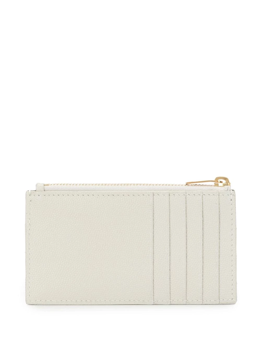 Heard you’re always in a rush? Make sure you always keep your cards organized with this cream leather monogram fragments zippered card case from Saint Laurent. Designed with multiple slots so you can put them all. You know you need it. Featuring a top zip fastening, a front logo plaque, gold-tone hardware, a main internal compartment, an internal logo stamp, stitching details and multiple card slots.