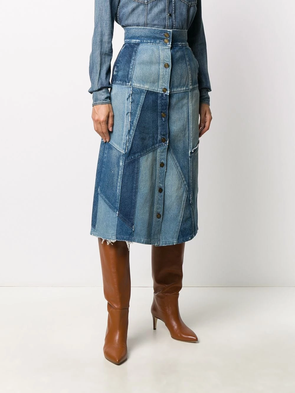 Saint Laurent’s mid-length skirt has us dreaming about life in the nineteen-seventies. Fabricated from cotton, the tonal A-line silhouette boasts an array of denim patchwork panels. Groovy baby.