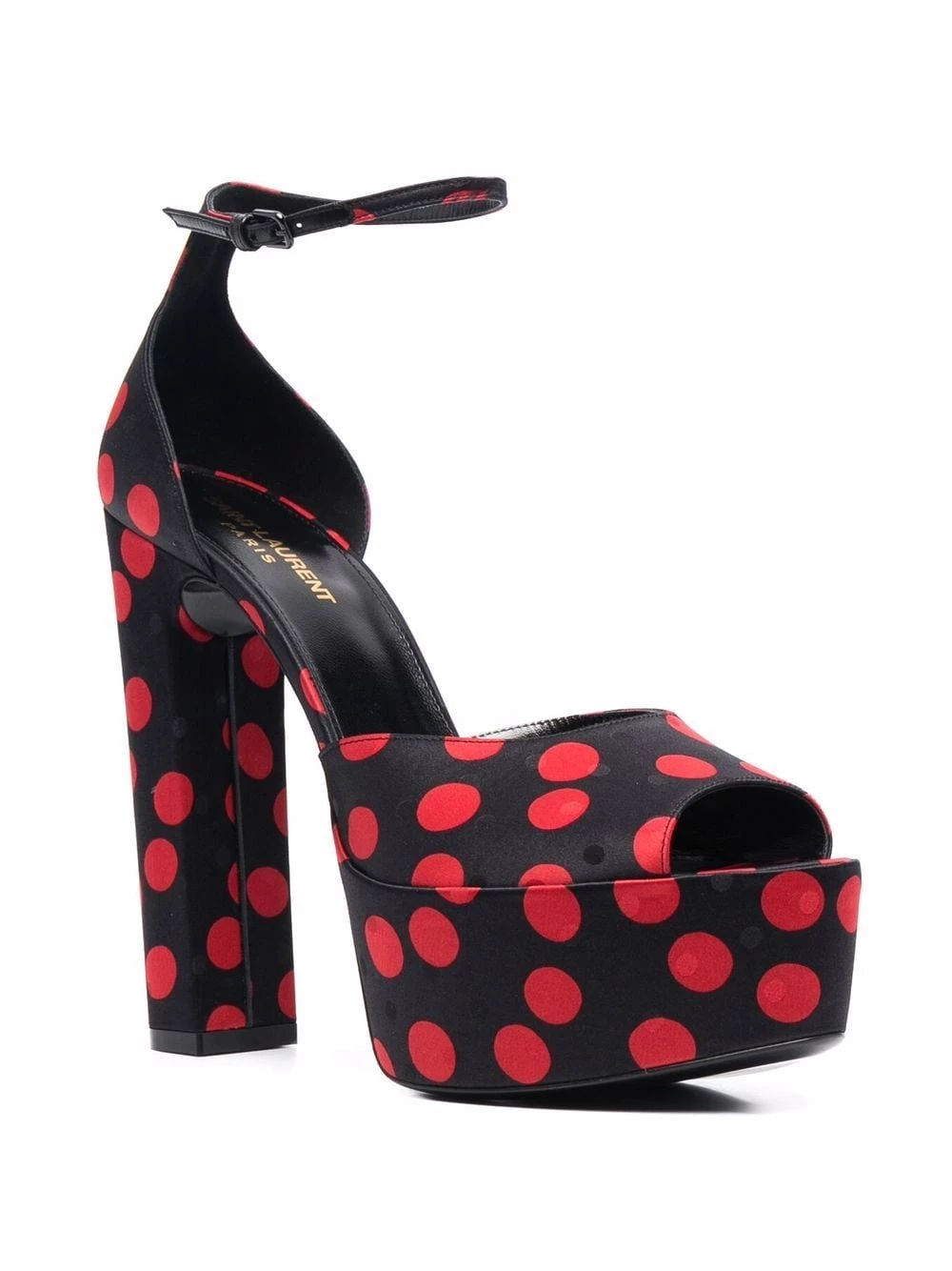 Saint Laurent’s sandals are a fun option for evening dressing. Set on a towering block heel that’s balanced with a platform sole, this satin iteration is patterned with playful polka dots all over.