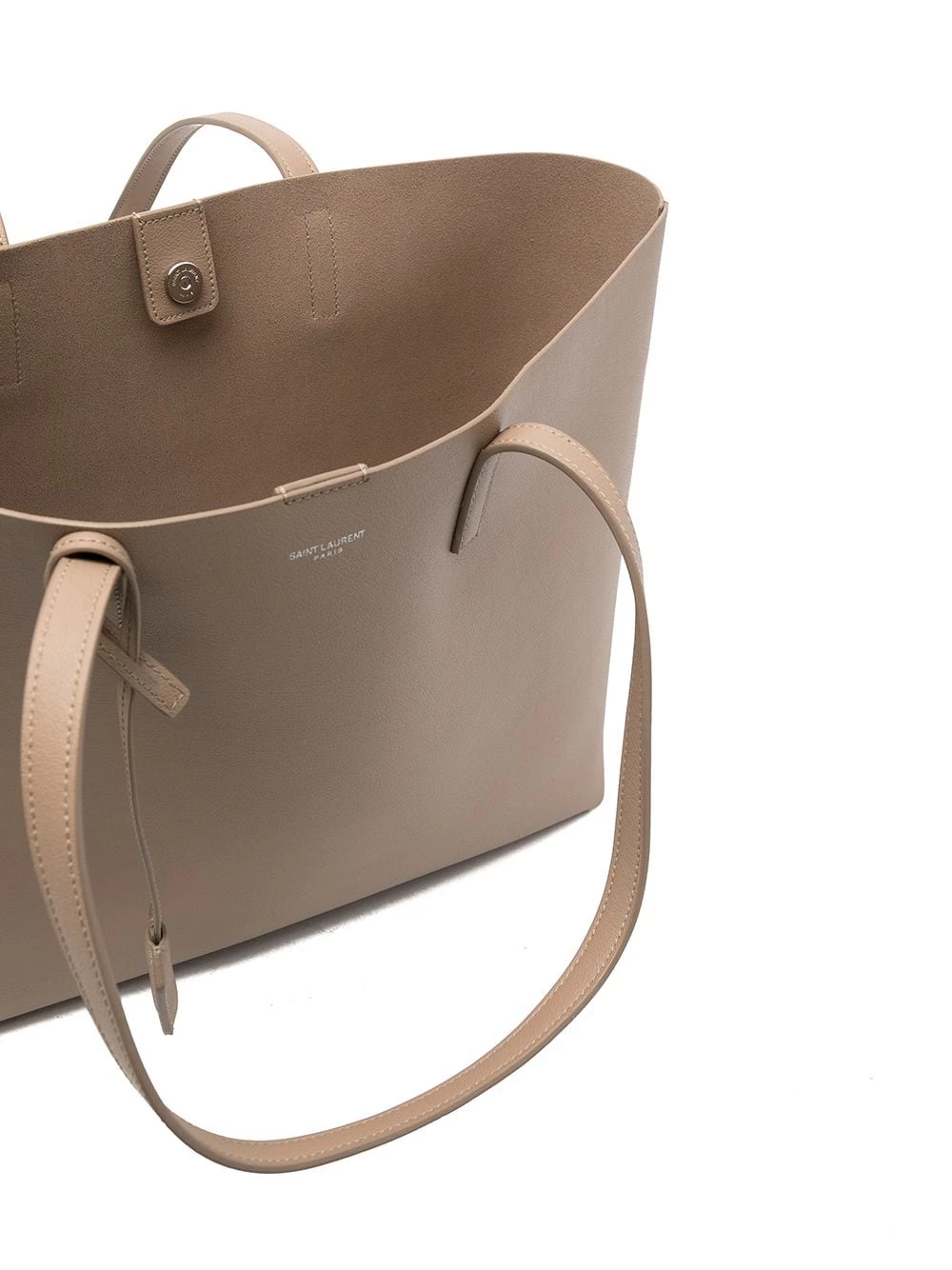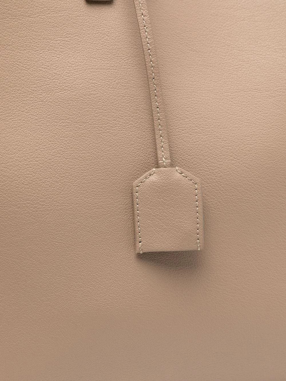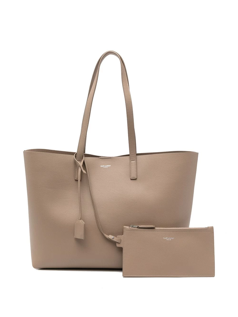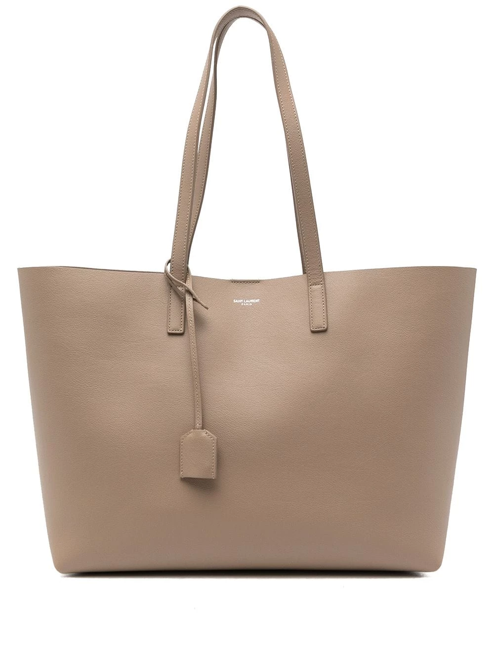 Saint Laurent keeps things simple with this large shopping tote. Crafted from supple calf leather, the understated design is detailed with a subtle debossed logo and a leather-encased Interlocking YSL charm.