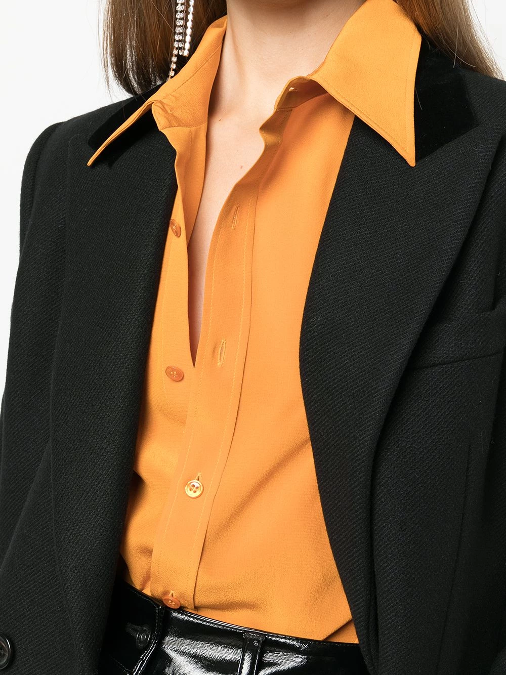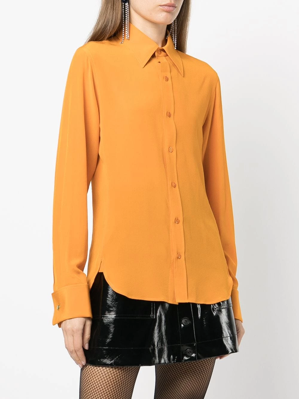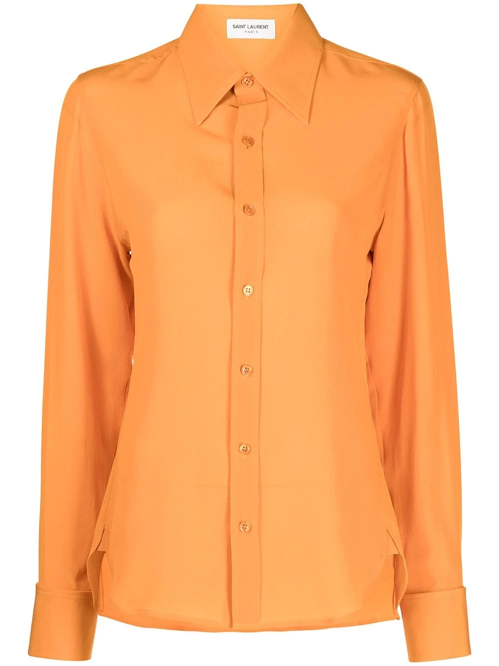 Made entirely from orange silk, Saint Laurent’s button-up shirt is the epitome of elegance with a relaxed flowy silhouette and turn-up buttoned cuffs.