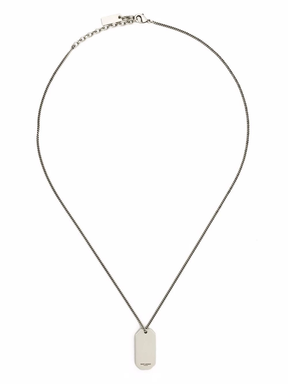 Saint Laurent’s bold and sleek aesthetic shone through in its menswear AW21 collection. Crafted in silver-tone brass, this classic curb chain necklace encapsaultes the season’s mood with its slick dog tag pendant.