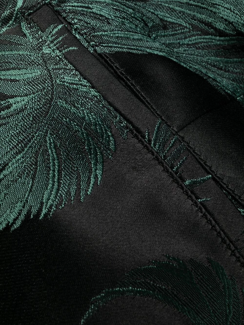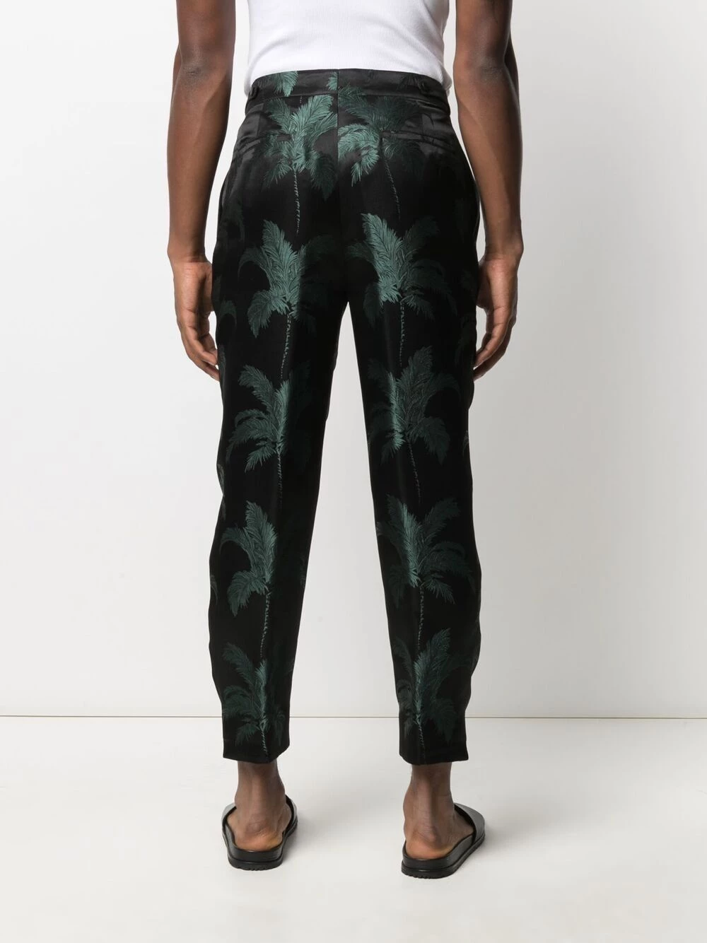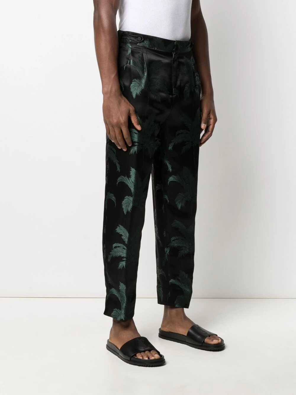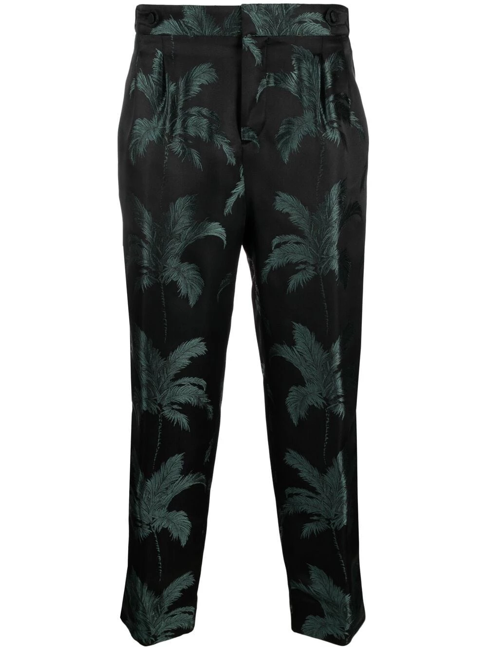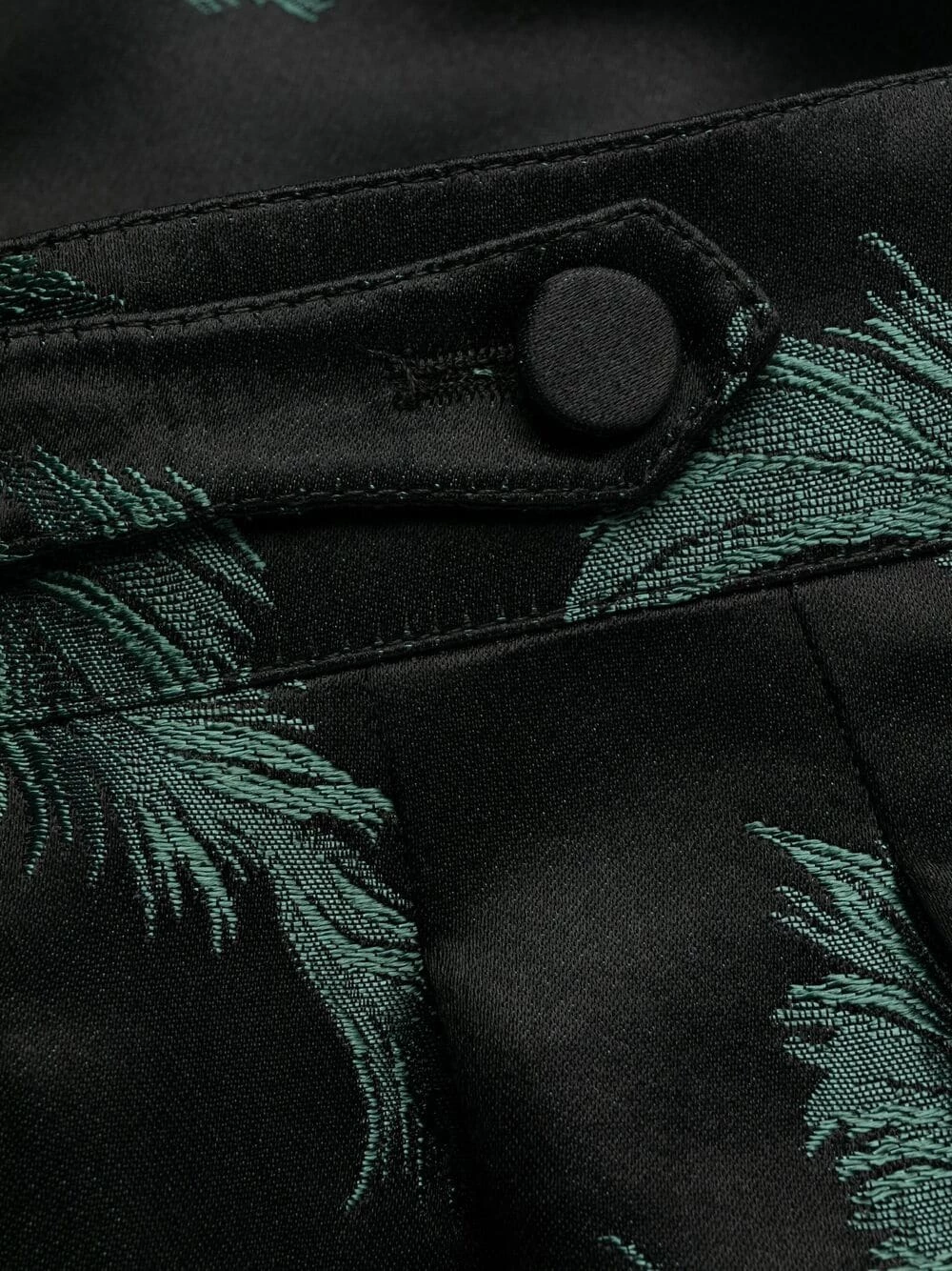 Black/green silk-blend palm tree-jacquard wide-leg trousers from SAINT LAURENT featuring patterned jacquard, concealed front fastening, belt loops, pleat detailing, two side slit pockets, two rear welt pockets and wide leg.