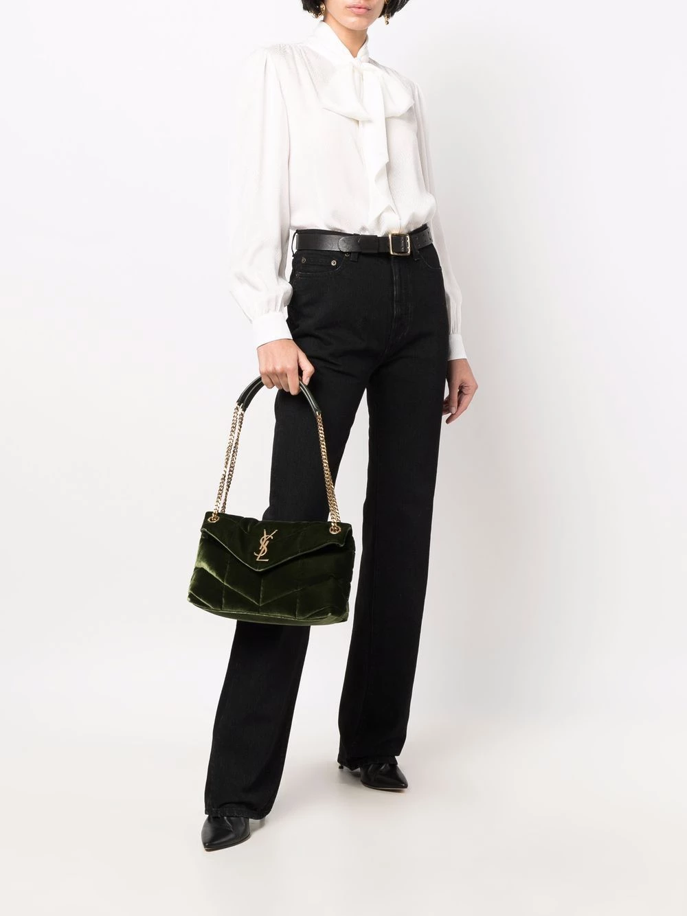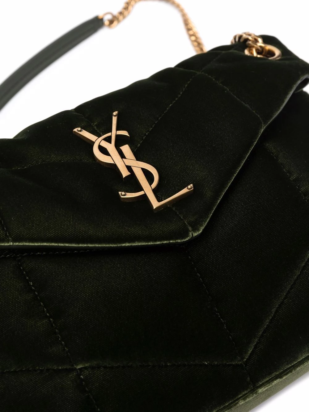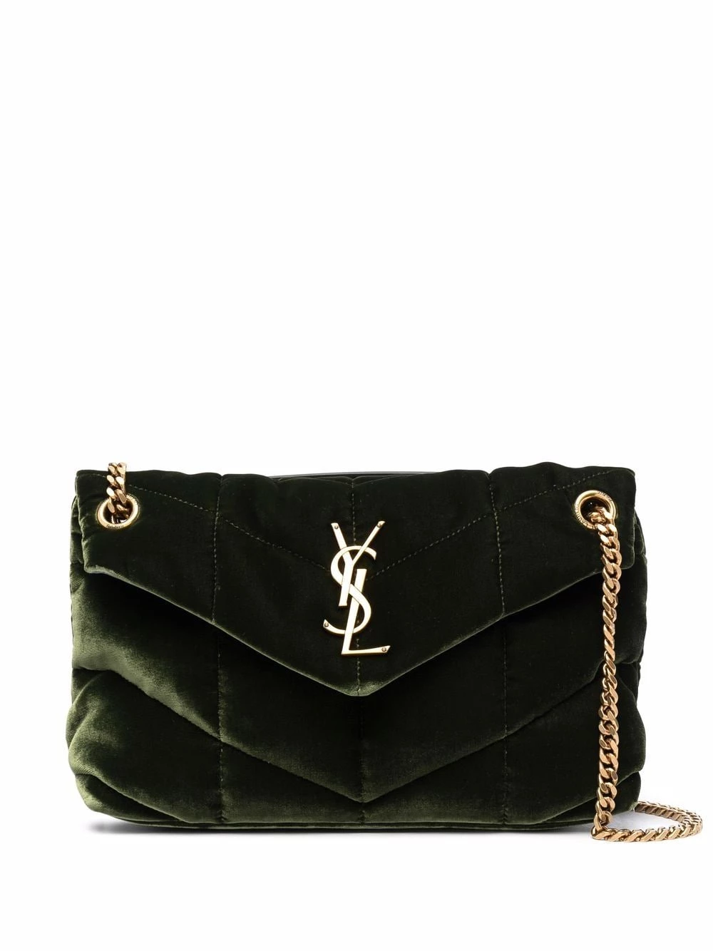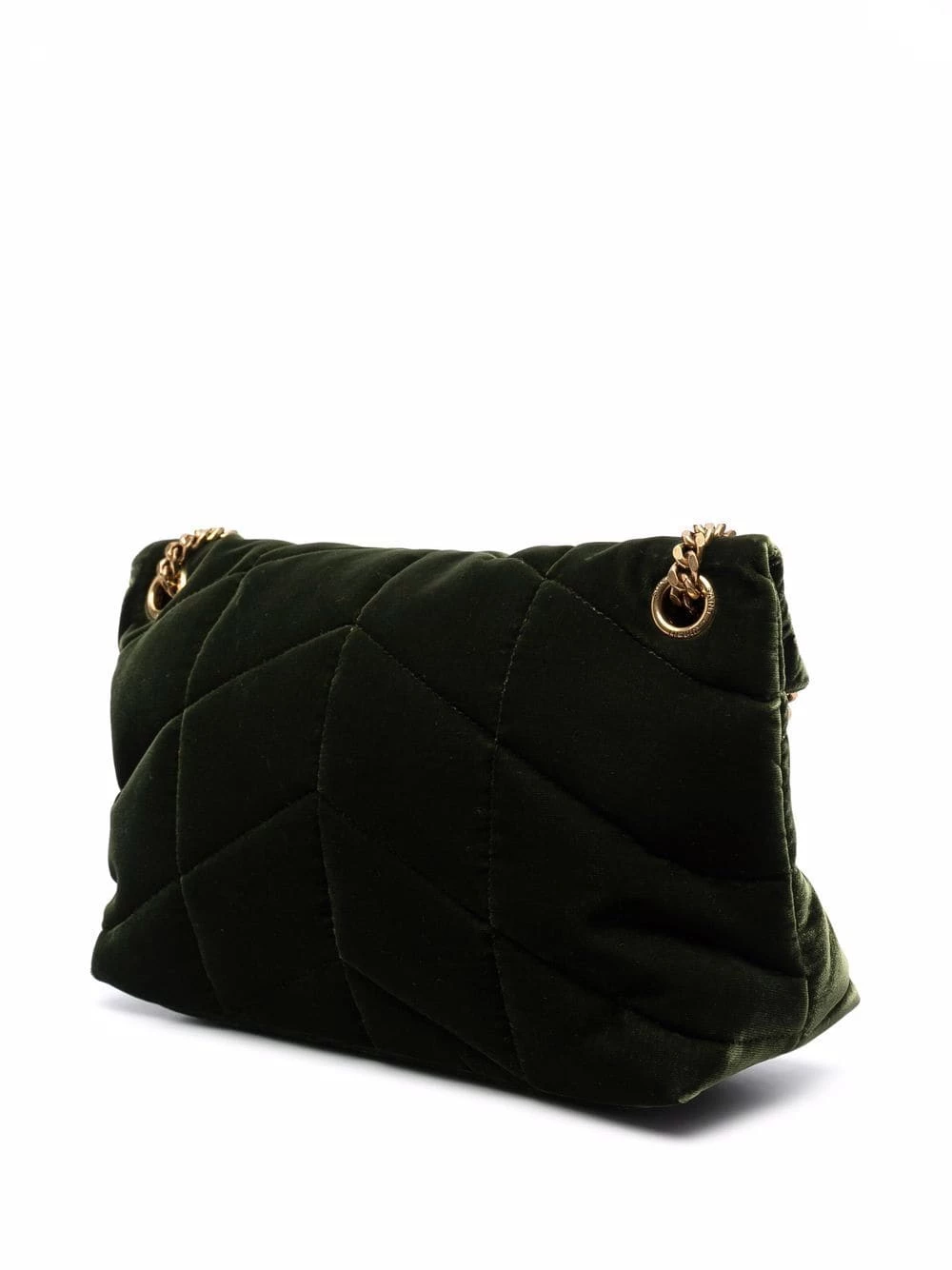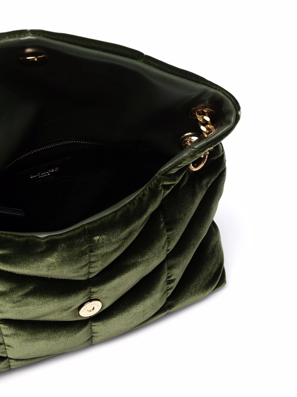 The Puffer small bag in khaki velvet features Saint Laurent’s signature chevron quilted detailing, and a gold front plaque with the iconic YSL logo on the front. Functionality is assured with the bag’s magnetic snap closure, and an adjustable chain link strap that allows for an effortless transition from shoulder to cross-body bag.