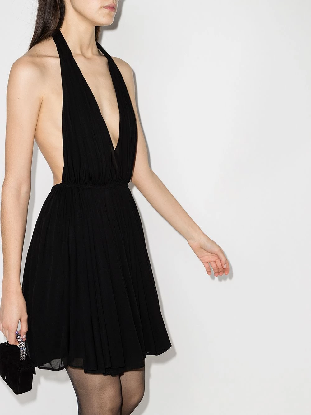 The little black dress, re-imagined. Saint Laurent’s interpretation of the classic LBD features a halterneck and elegant plunging V-neck. The open back and pleated skirt give it a glamourous feminine touch, making it perfect for special occasions.