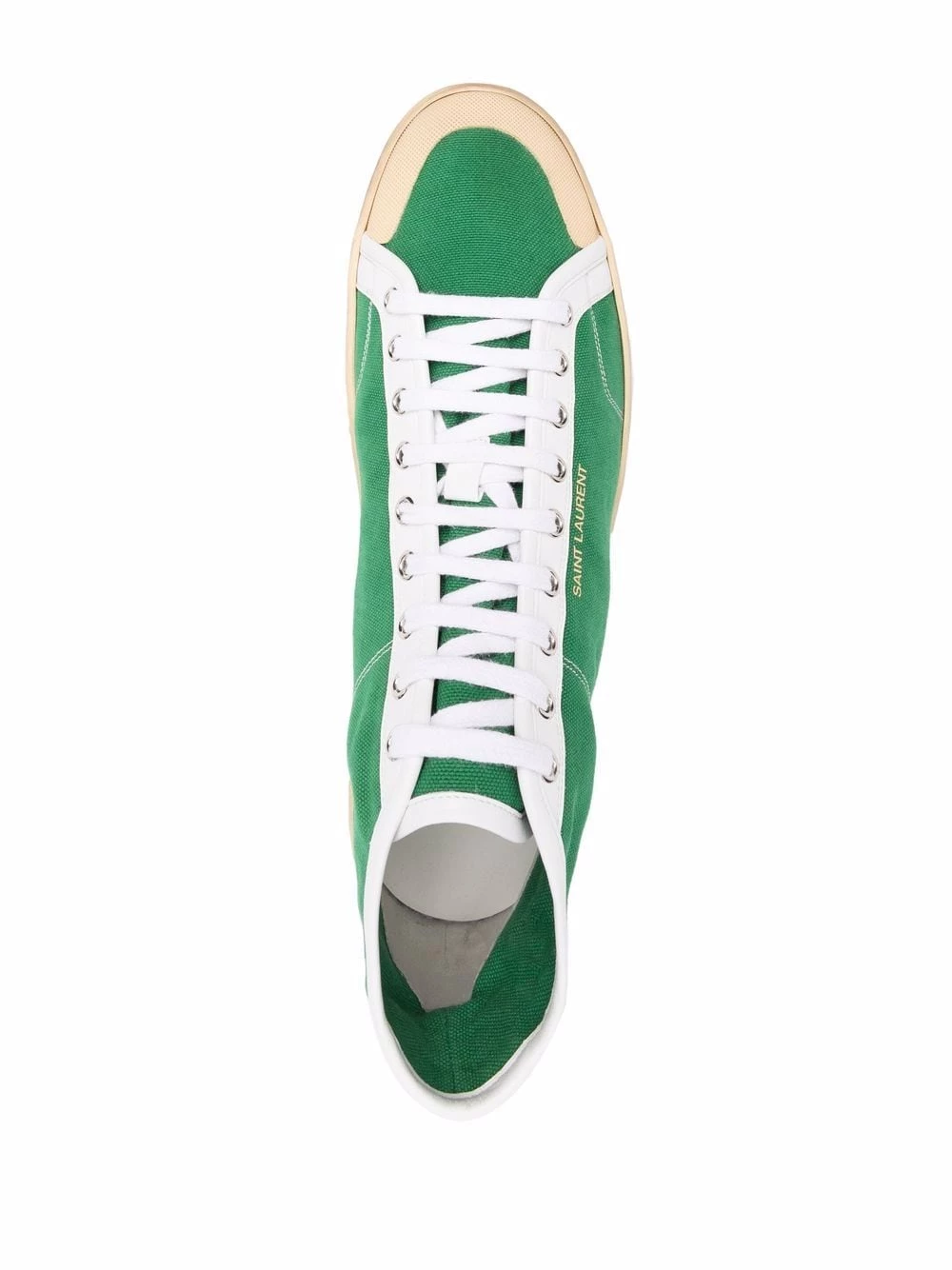Saint Laurent’s mid-top lace-up sneakers are a bright choice with their avocado green canvas upper that is decorated with gold-tone logo lettering.