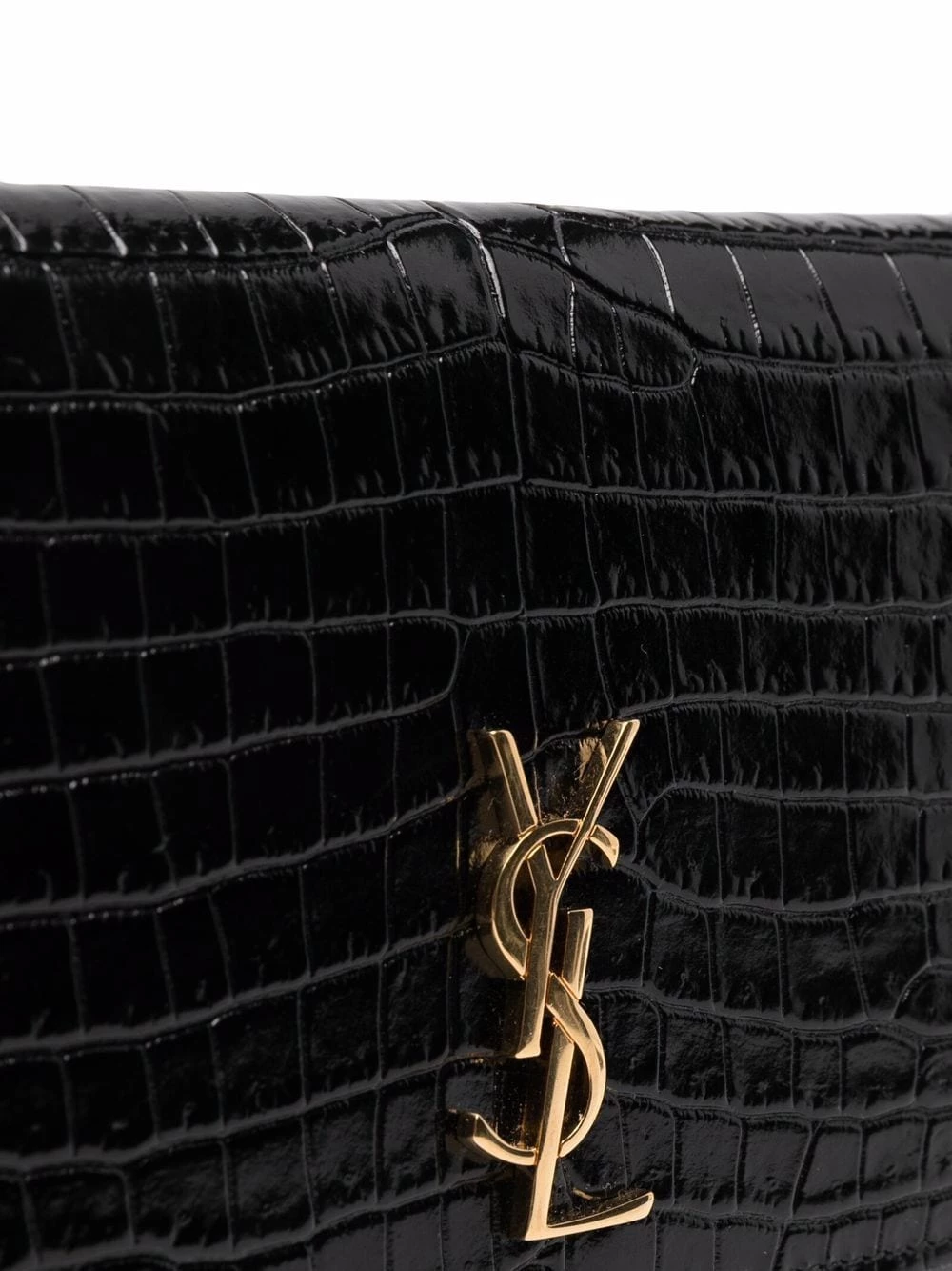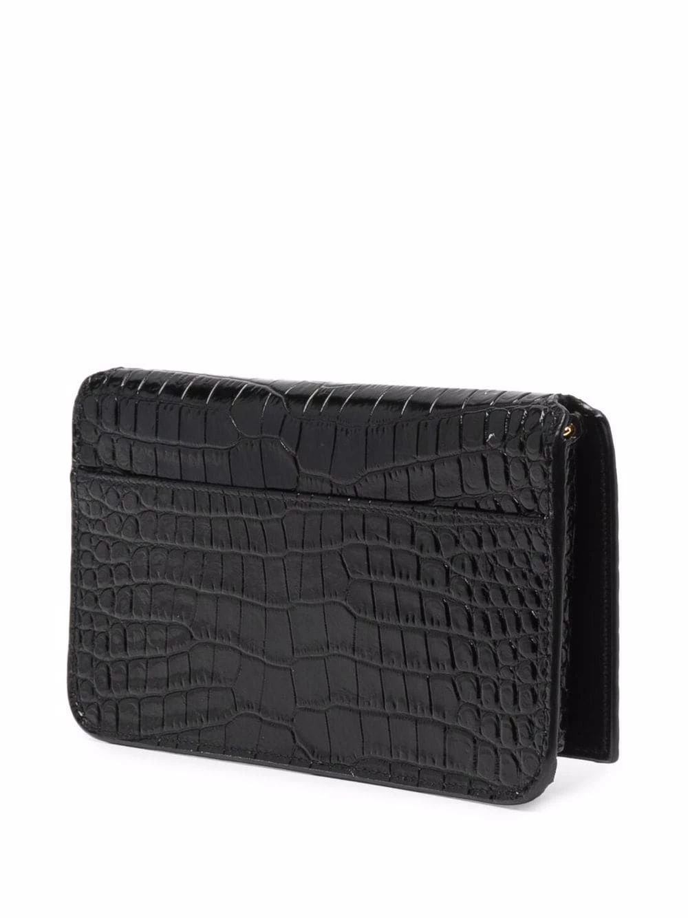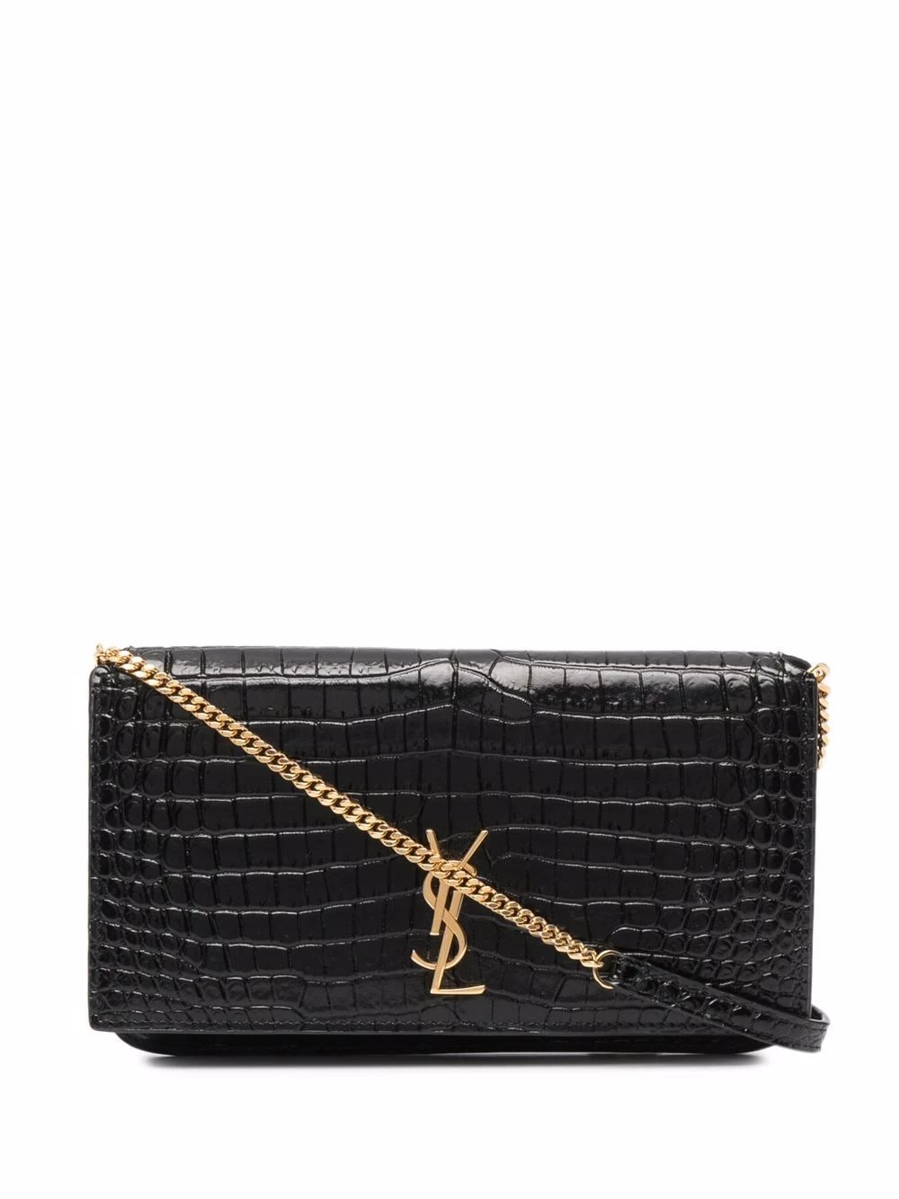 Saint Laurent’s mini bag underscores the brand’s emphasis on refined elegance. Crafted from croc-effect black leather, this understated iteration is solely decorated with a sleek logo plaque.ย