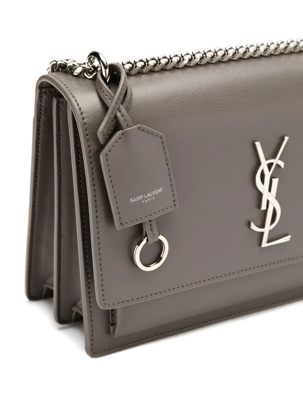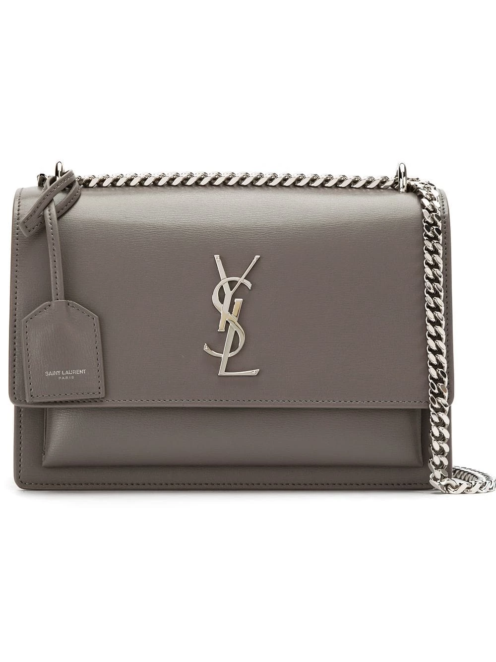 Sunsets make us think about happy things like this medium Sunset bag from Saint Laurent. Constructed from calf leather, this shoulder bag is a perfect way to cheer up your look and your mood. The best to finish your day… Featuring a chain and leather strap, silver-tone hardware, a front logo plaque, a hanging key fob, a foldover top with magnetic closure, multiple interior compartments, an internal slip pocket and an internal logo plaque.