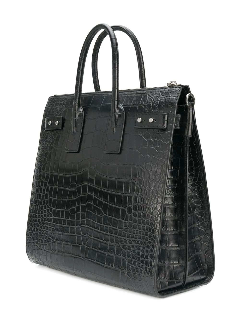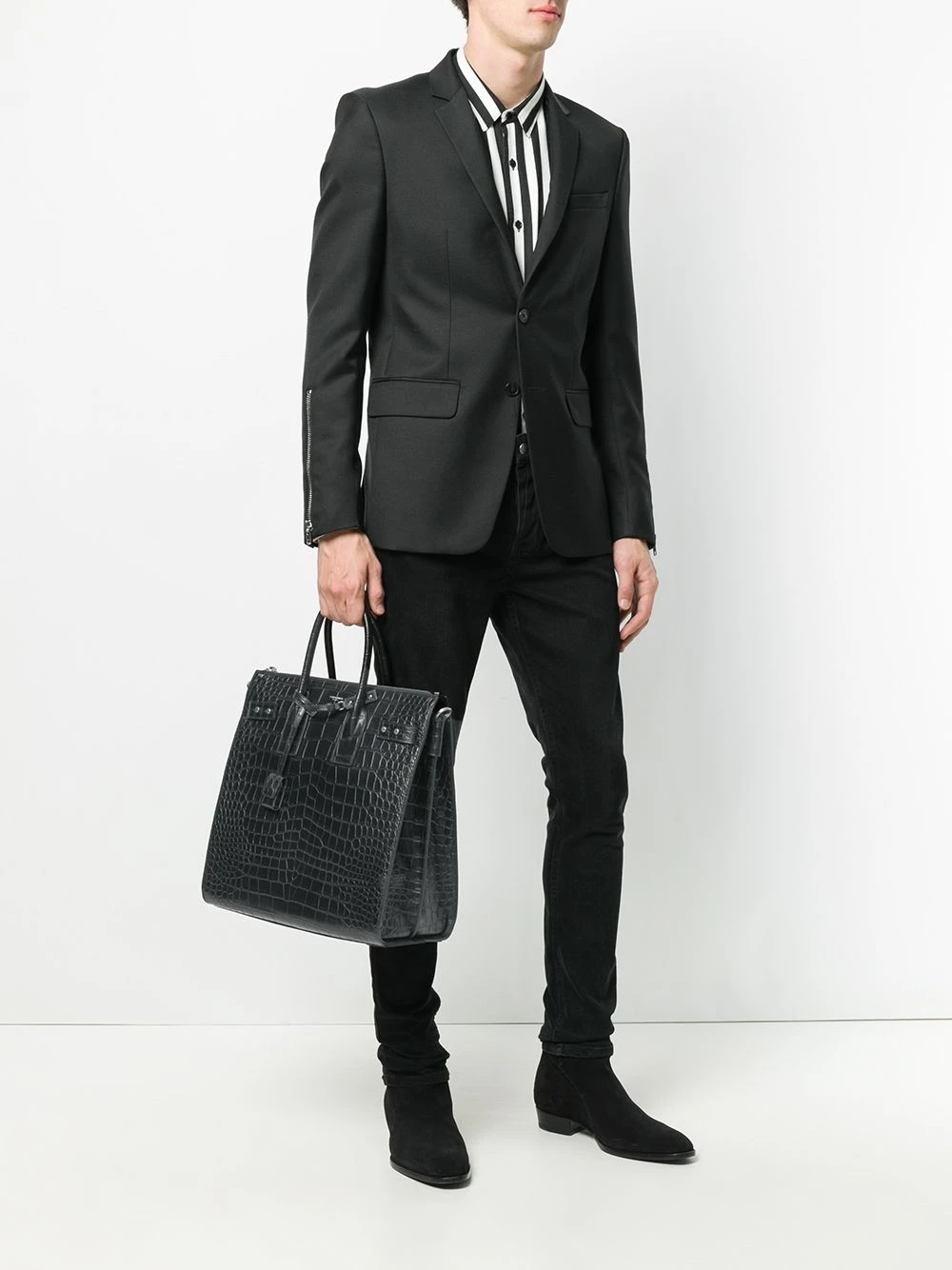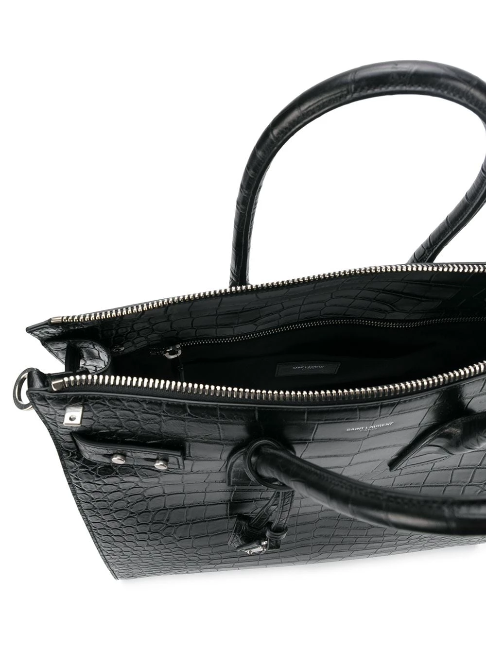 Luxury French fashion house Saint Laurent, originally founded by Yves Saint Laurent, is renowned for its pieces that are infused with the label’s signature Parisian glamour. This is showcased in this sophisticated black tote from the brand’s AW17 collection. Constructed from Italian patent leather, the piece features round top handles, a hanging leather tag, a detachable and adjustable shoulder strap, a front centre logo stamp, a top zip closure and metallic hardware.