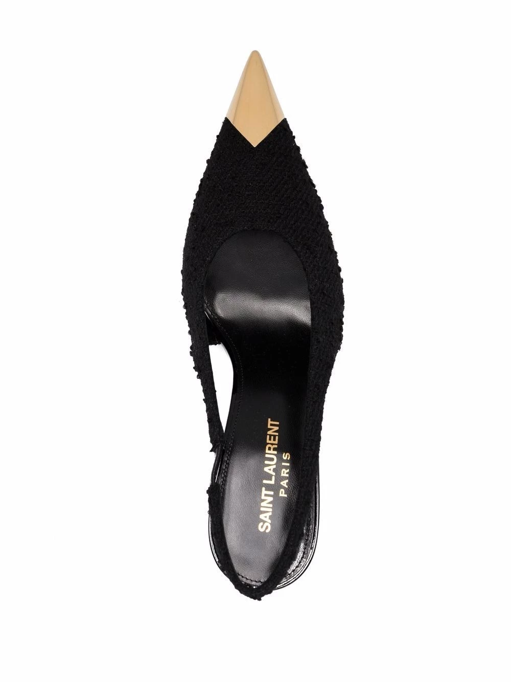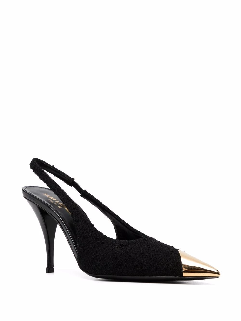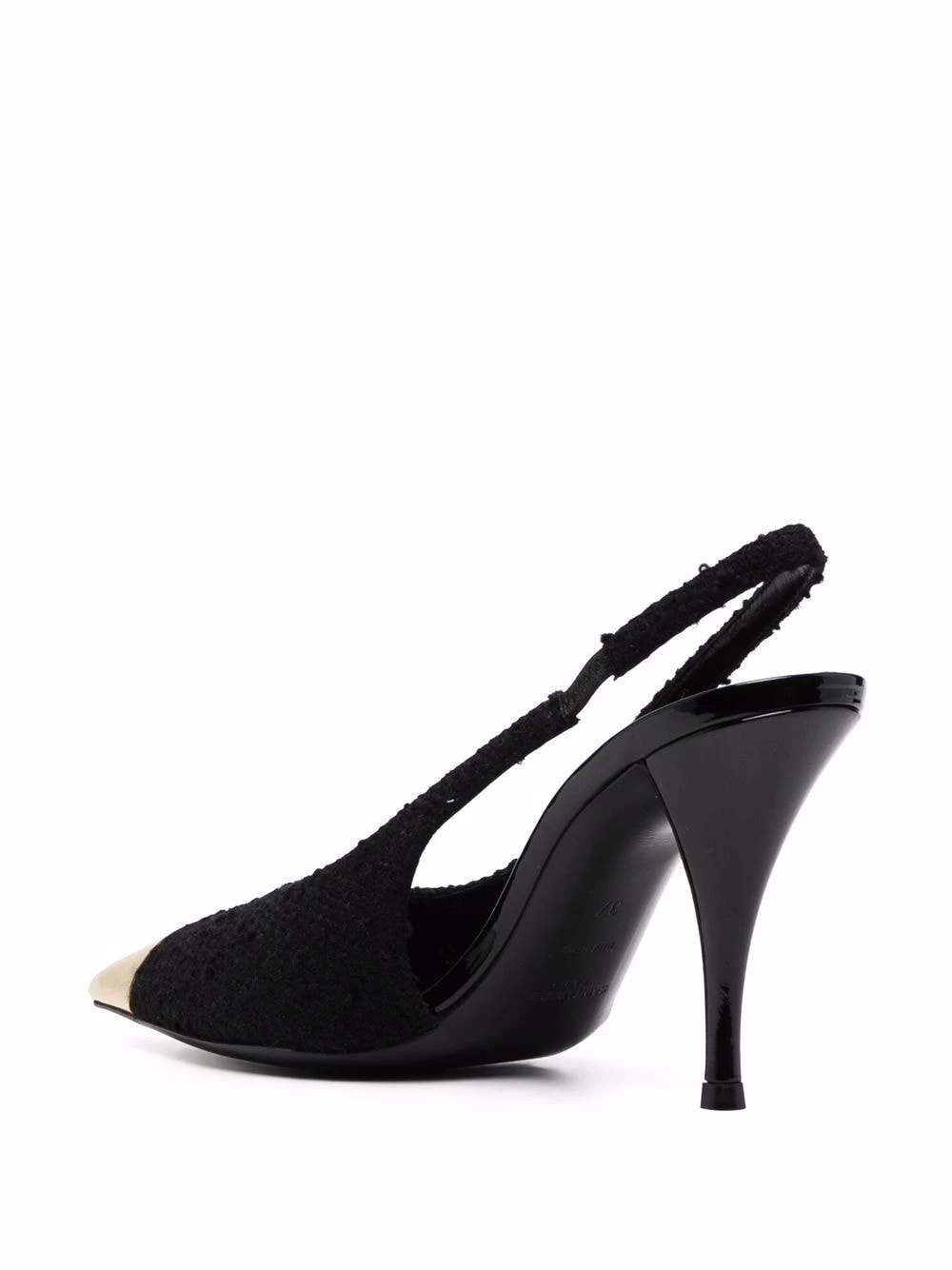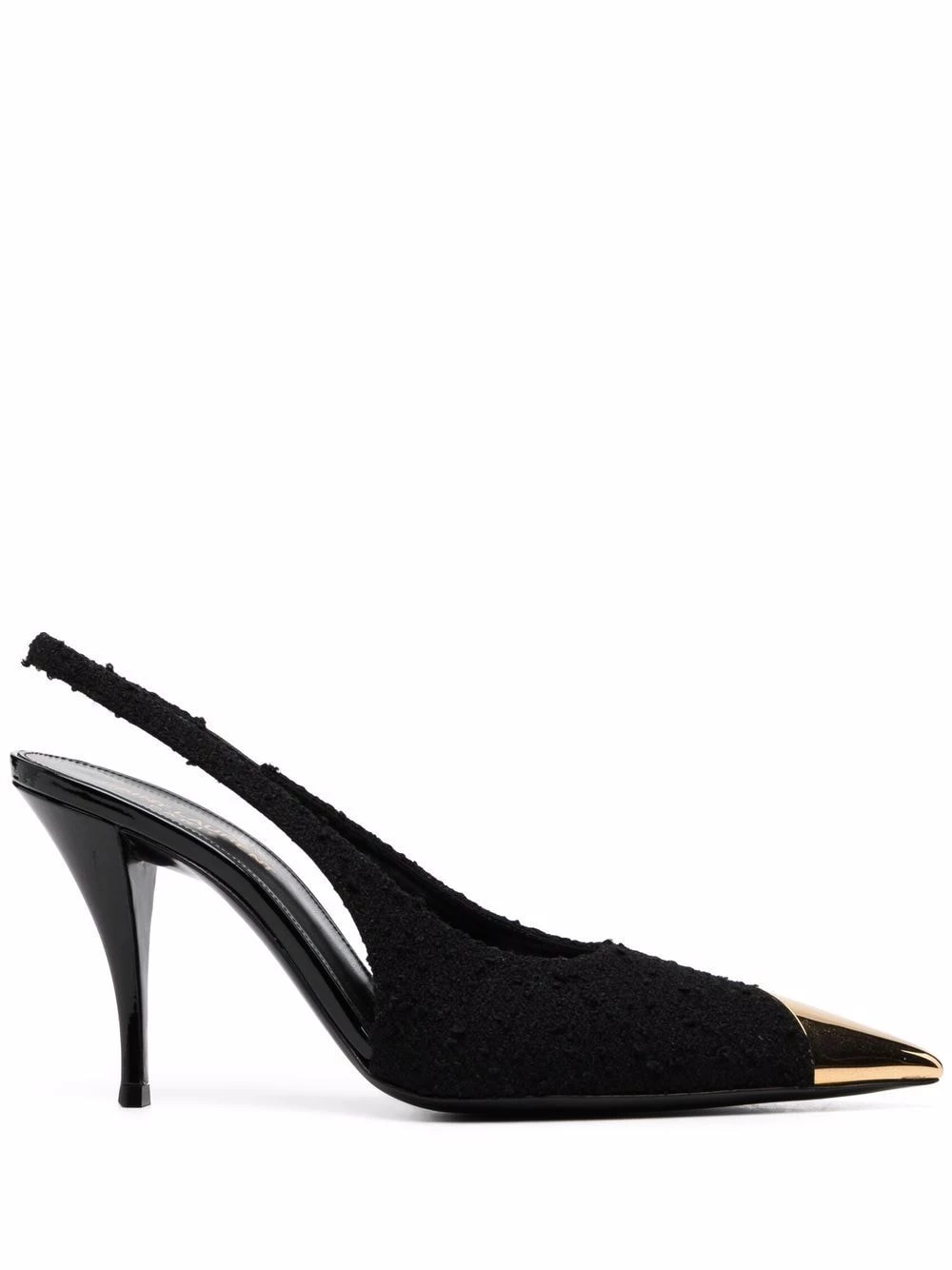 Aligned with Saint Laurent’s bold spirit, these slingback pumps feature a black bouclé construction. The style’s opulent aesthetic is enhanced by the gold-tone toe cap and the 90mm heel.