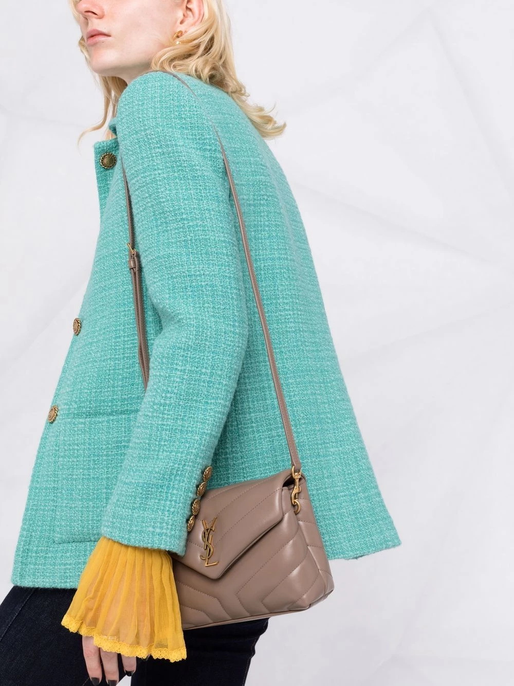 Saint Laurent’s monogram logo was created by graphic designer Cassandre in 1961. Now synonymous with the brand, it is featured in gold-tone hardware at the front of this bag. Layered over chevron-quilt detailing, the sleek style of the house is showcased in this design.