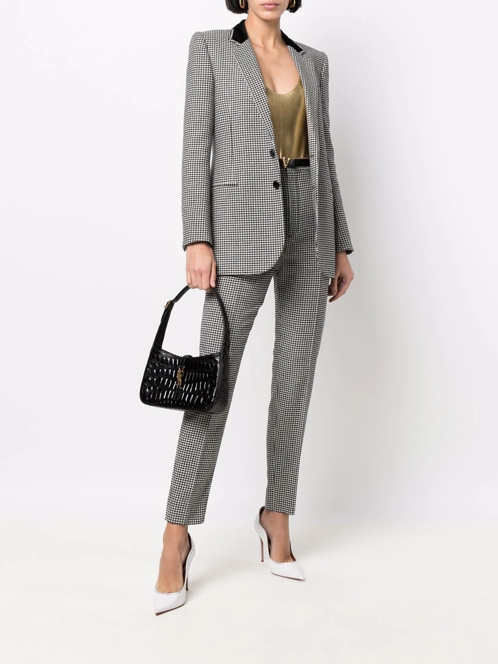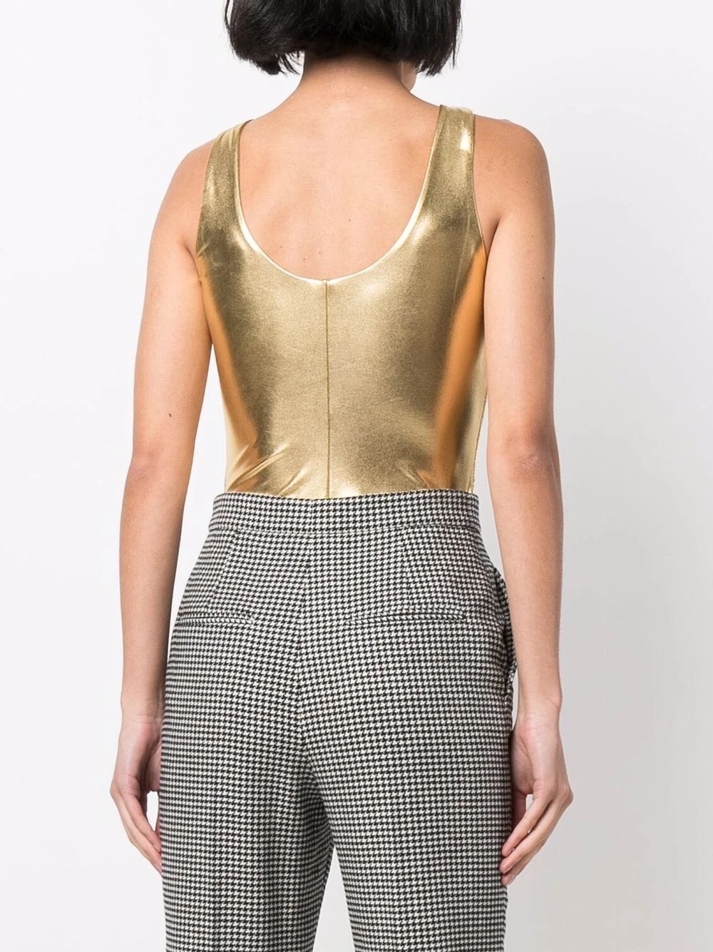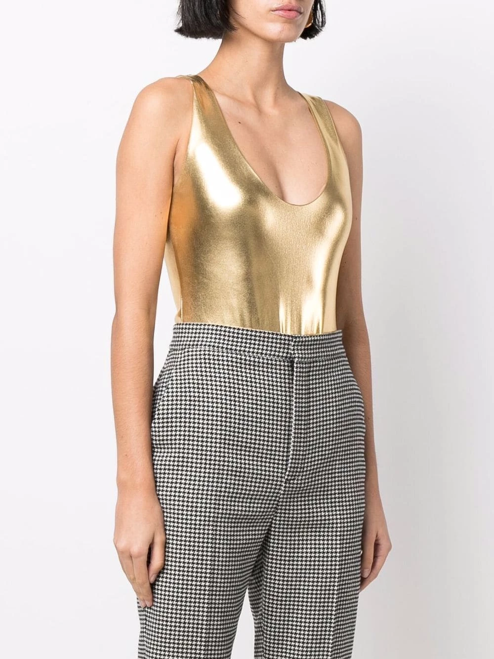 The proof that sometimes the simplest pieces can make the biggest statement. This Saint Laurent metallic-effect lamé bodysuit in a stretch construction has a round neck, low scooped back and high-cut legs.