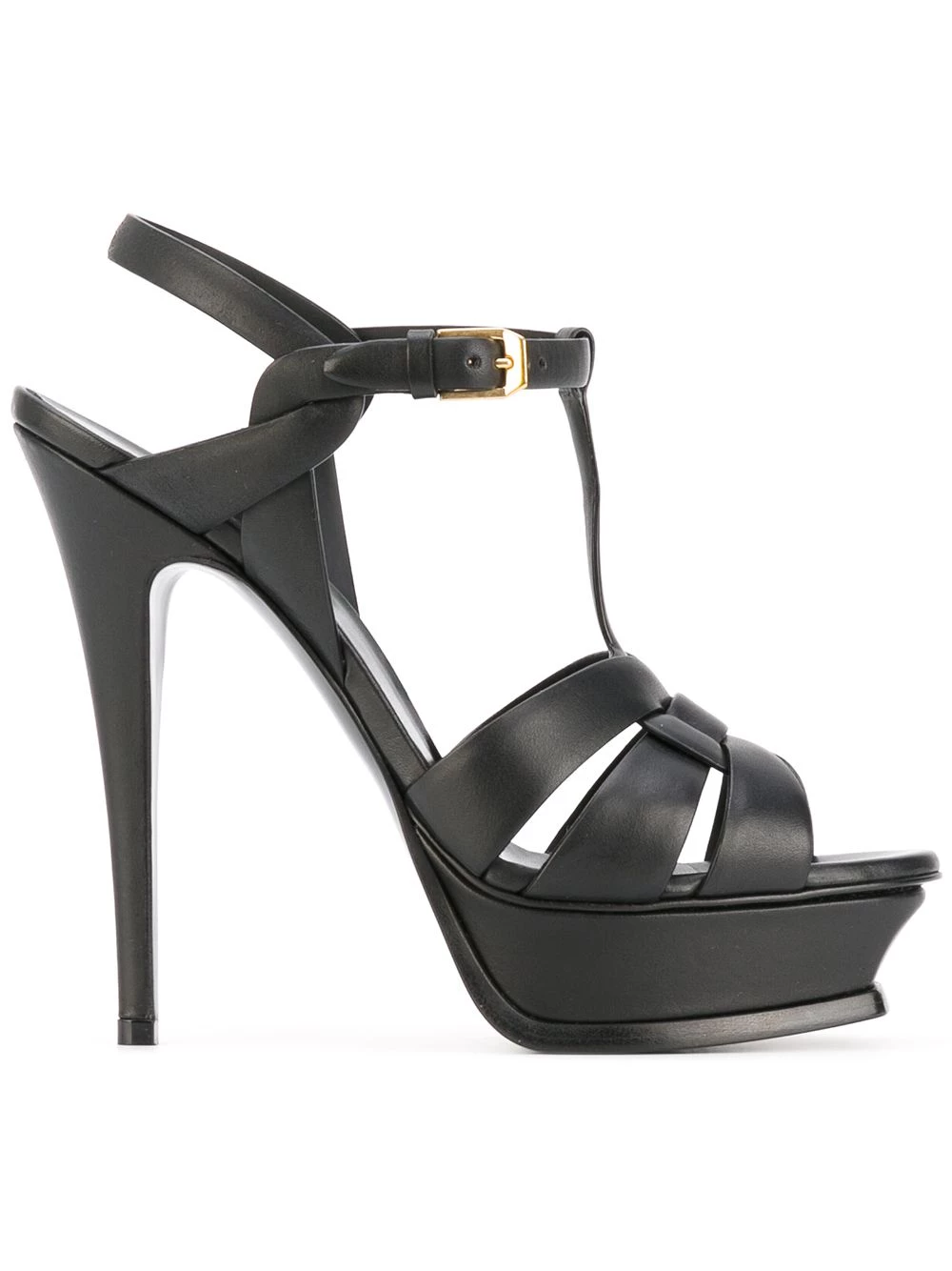 Pay tribute to your great style. These black leather Tribute sandals from Saint Laurent tower atop a sky-high heel for instant drama. Every step counts. Featuring a high stiletto heel, a slingback ankle strap, a side buckle fastening, an open toe, a branded insole, a front platform and a caged design.