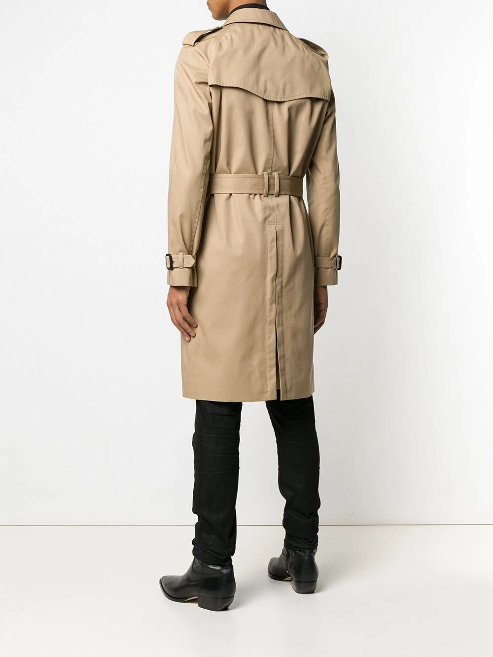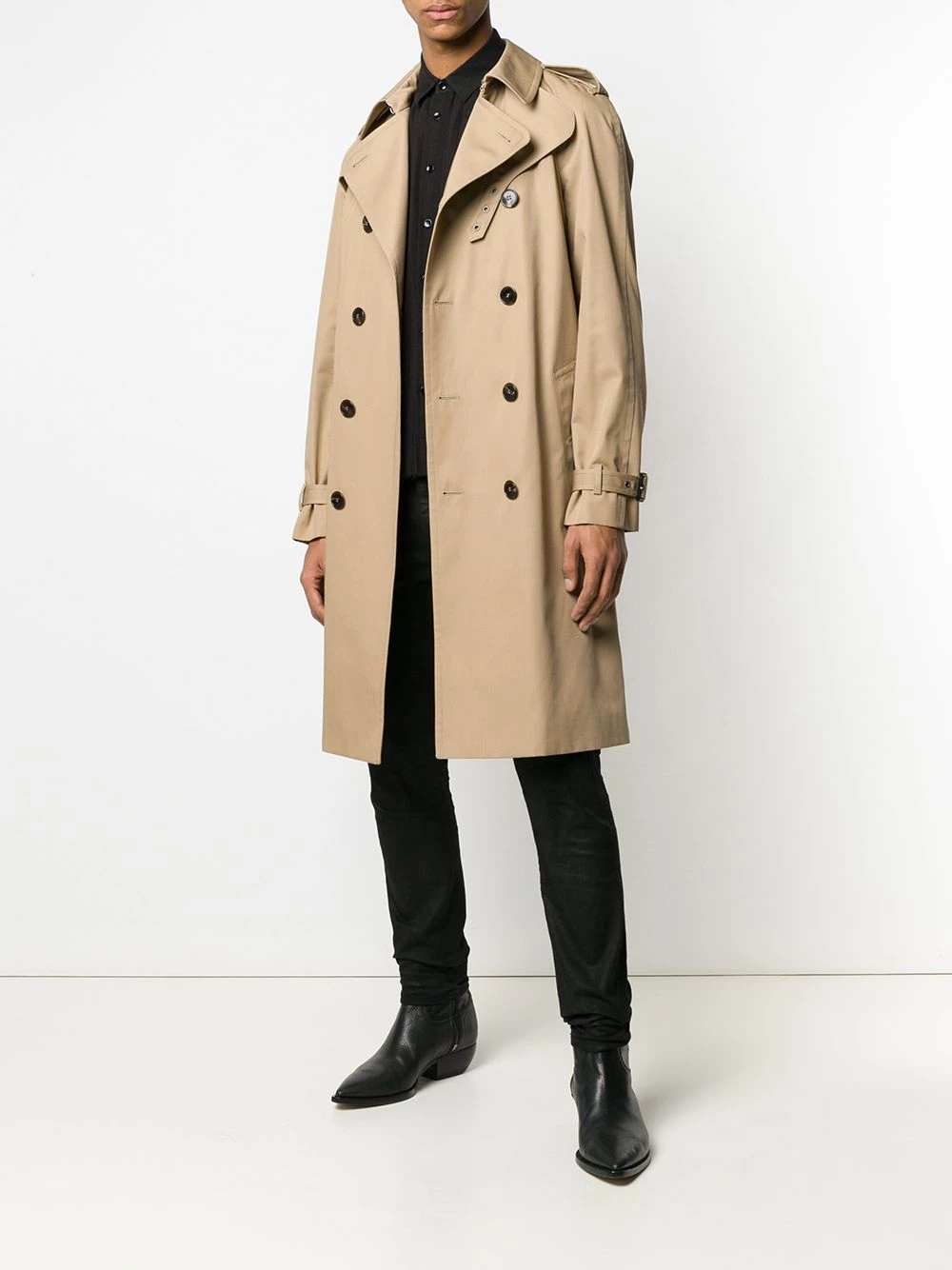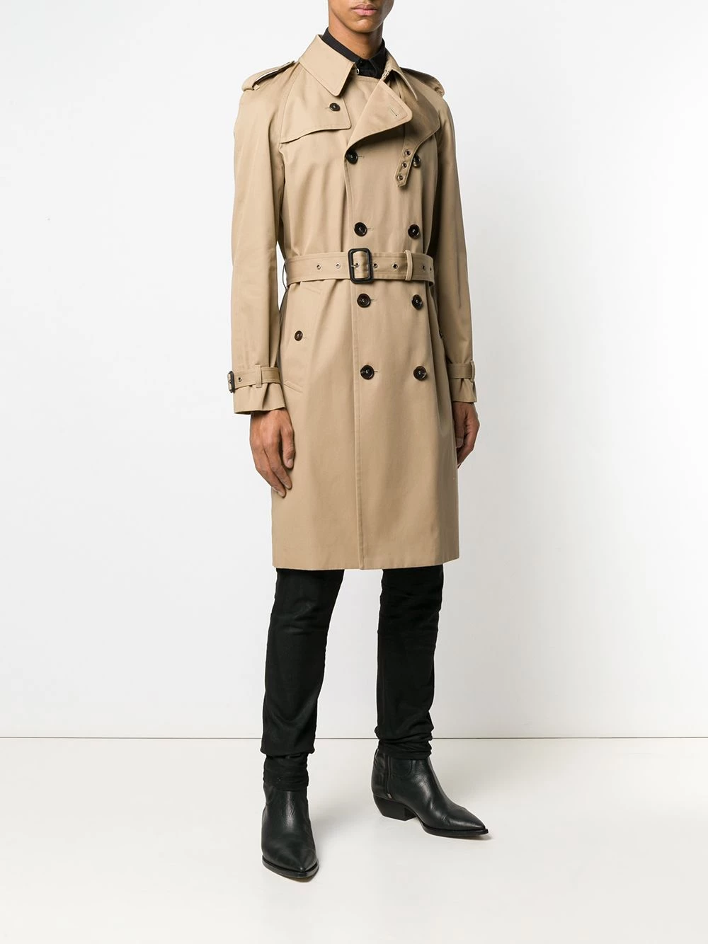 Staying true to its timeless approach, Saint Laurent presents this trench coat. In a classic beige hue and spun from cotton-blend, this piece features a double-breasted fastening and elegant belted waist, while the storm flap and epaulettes on the shoulders give it a classic appeal.