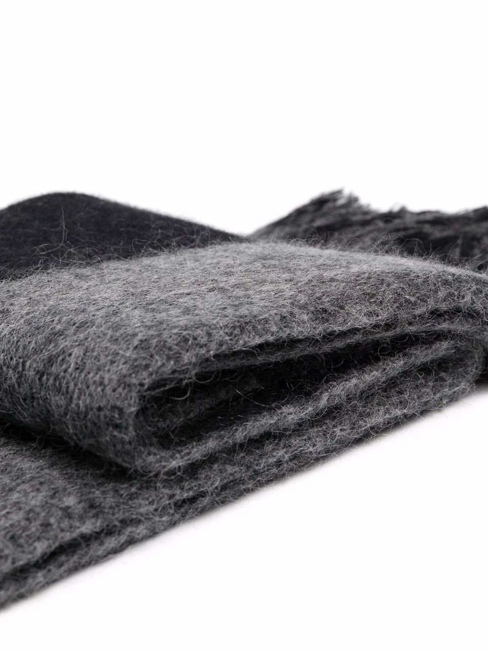 Grey/black mohair/alpaca wool/virgin wool logo-print scarf from SAINT LAURENT featuring two-tone design, logo print to the front and fringe detailing.