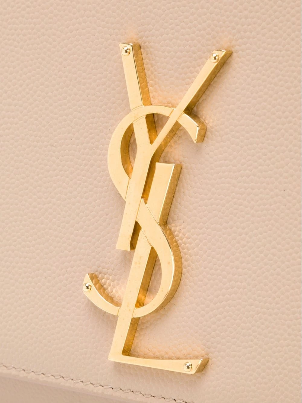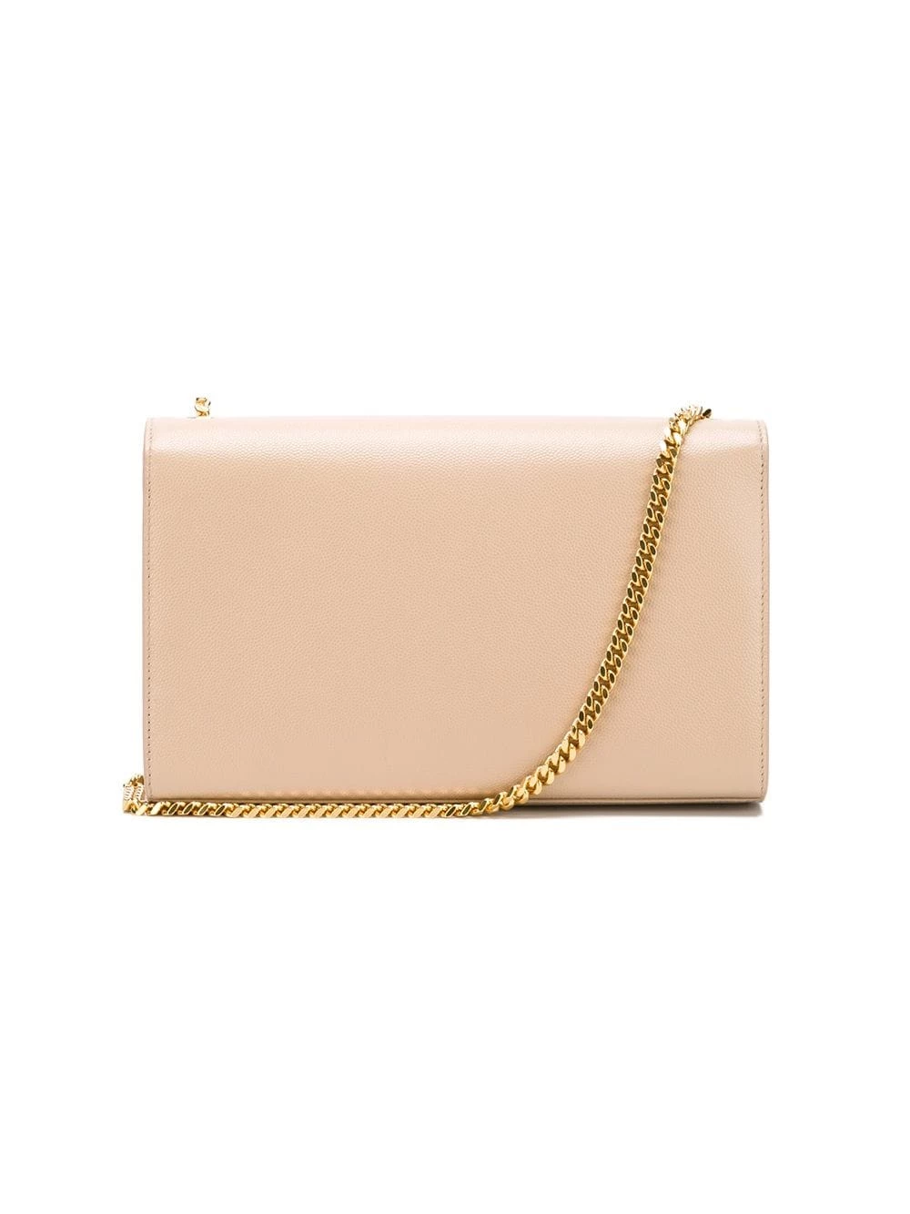 Dark beige calf leather medium ‘Monogram’ shoulder bag from Saint Laurent featuring a foldover top with magnetic closure, a gold-tone logo plaque, a gold-tone chain shoulder strap and an internal patch pocket.