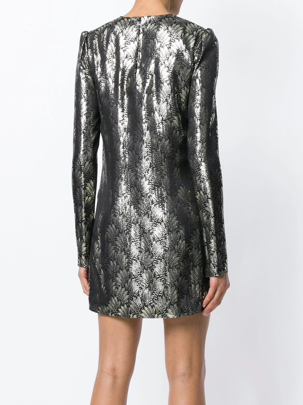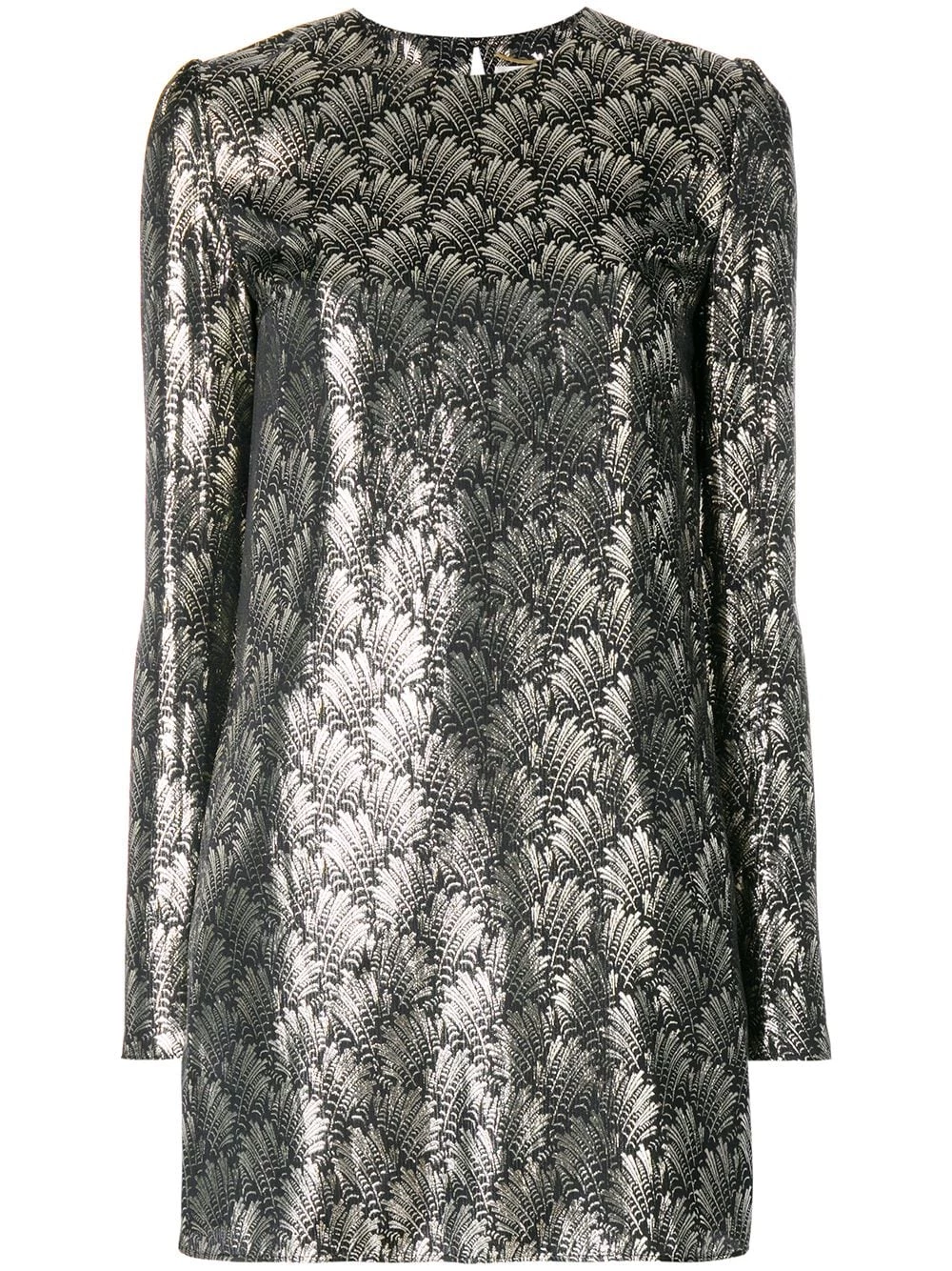 Shimmer your way into the new year with this Saint Laurent dress. A part of their new collection, this mini dress is embellished with a metallic silver finish. Made in France, it features a round neck, long sleeves and a rear keyhole detail.