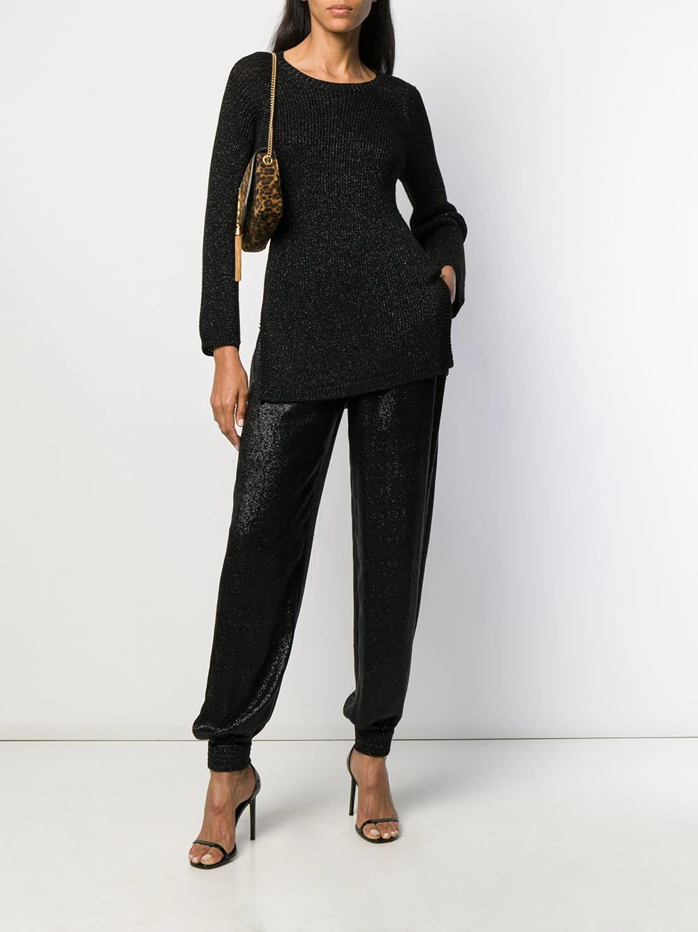 Founded in 1961 by innovative designer Yves Saint Laurent, French luxury fashion house Saint Laurent fuses expert craftsmanship with the label’s signature rock ‘n’ roll flair as seen with this black metallic thread ribbed jumper. Featuring a crew neck, long sleeves, a ribbed hem and cuffs and metallic threading.