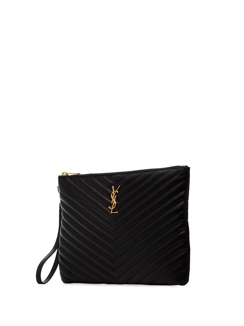 Black leather quilted monogram clutch bag from Saint Laurent featuring signature YSL logo plaque, quilted, gold-tone hardware, top zip fastening and detachable wrist strap.