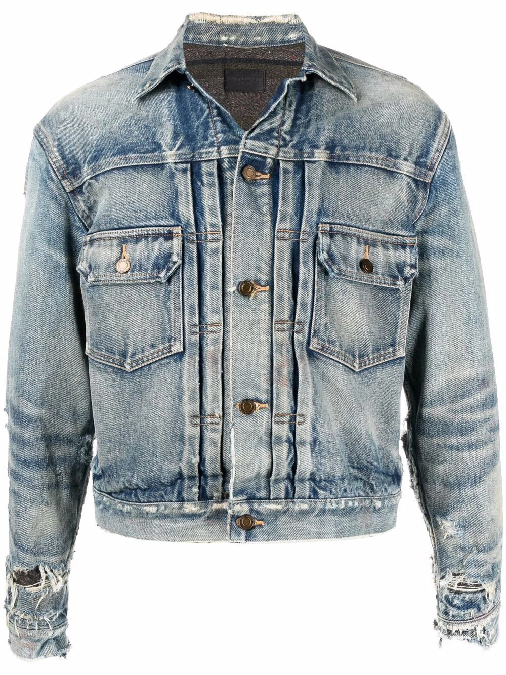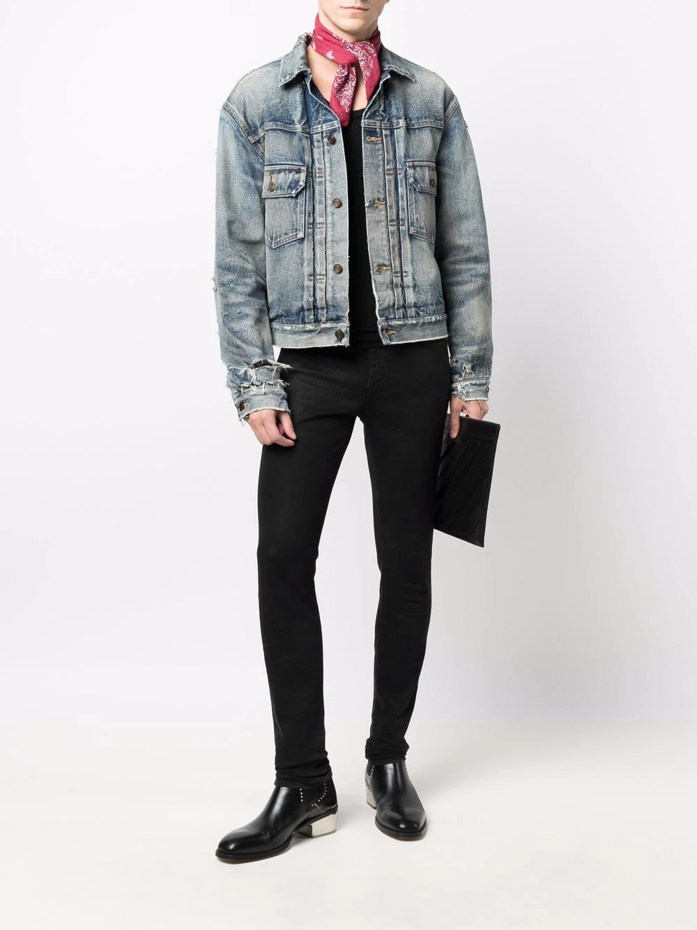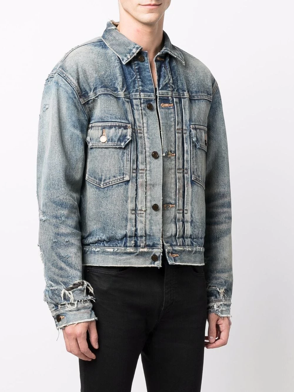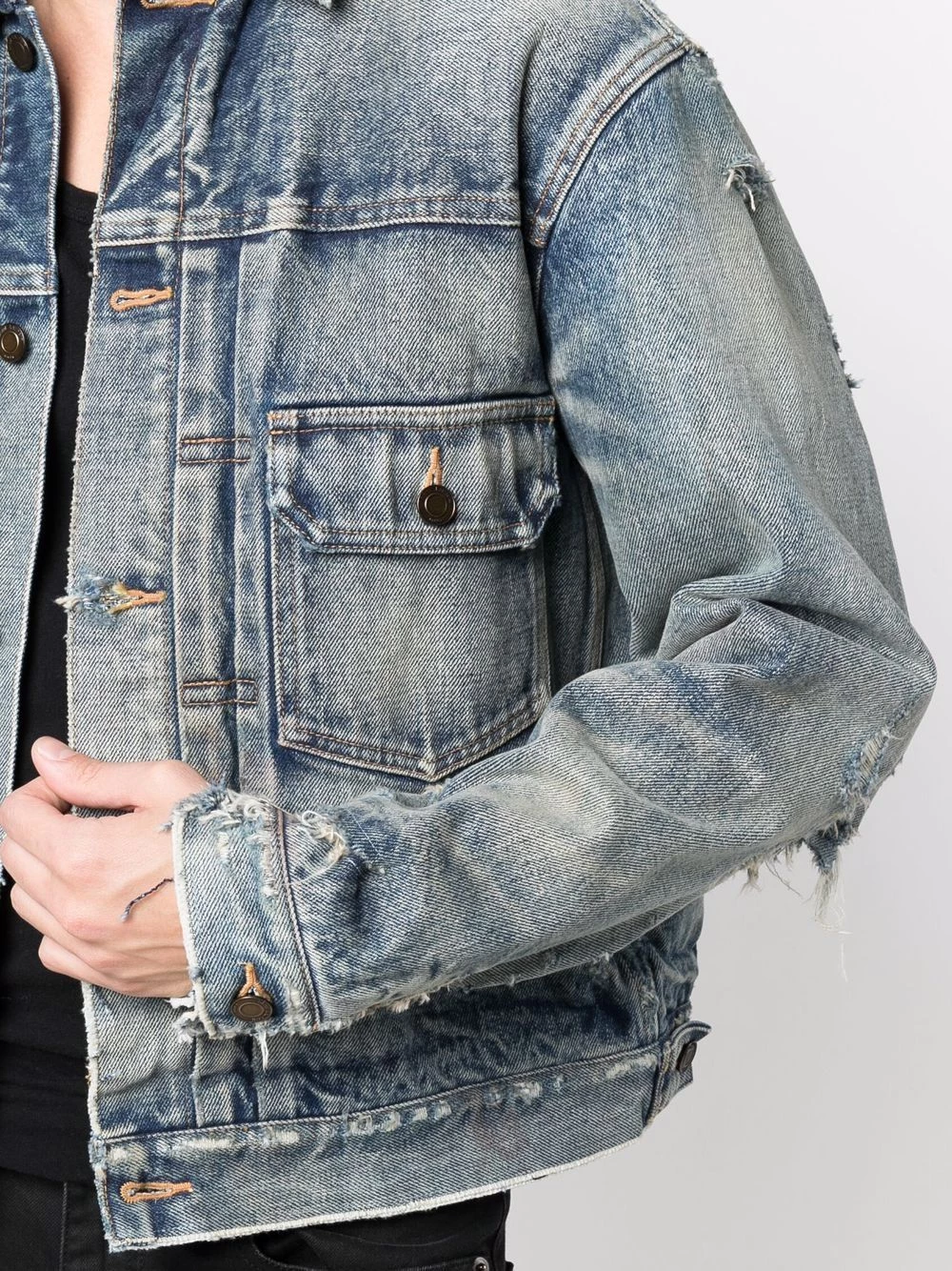 With a style that is inspired by rock musicians and past eras, Saint Laurent presents this distressed denim jacket. The classic design is accented with a faded look and destroyed effects all over. Cut for a slim fit, it fastens with a button closure at the front.ย