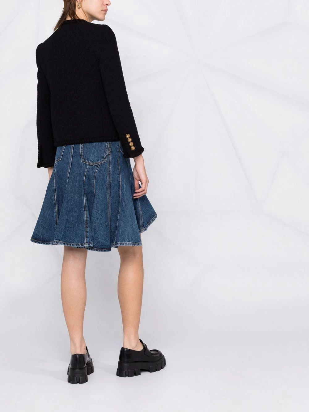 Saint Laurent’s French heritage is evident in this classic tweed jacket. The practical black design with a high, rounded collar and patch pockets is elevated by the intricate braided edges and gold buttons embossed with the iconic YSL logo.