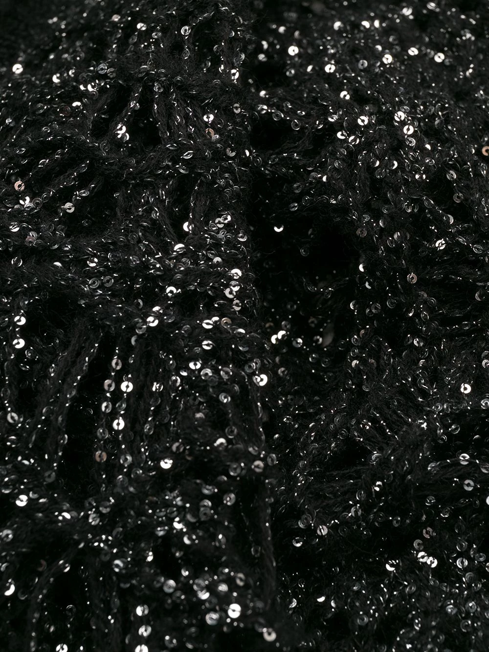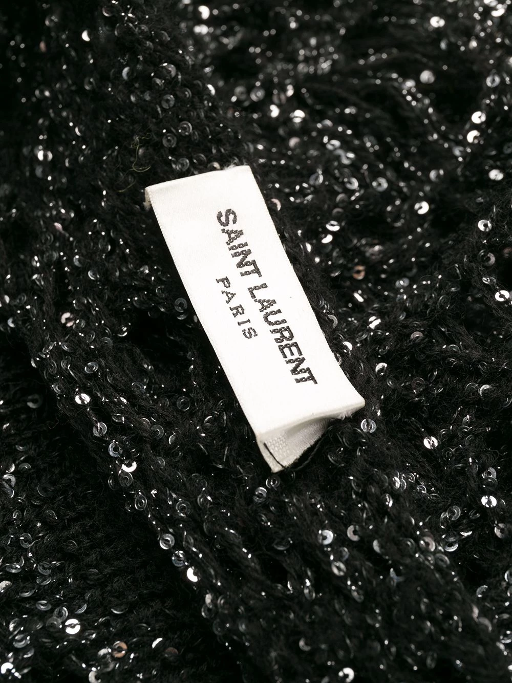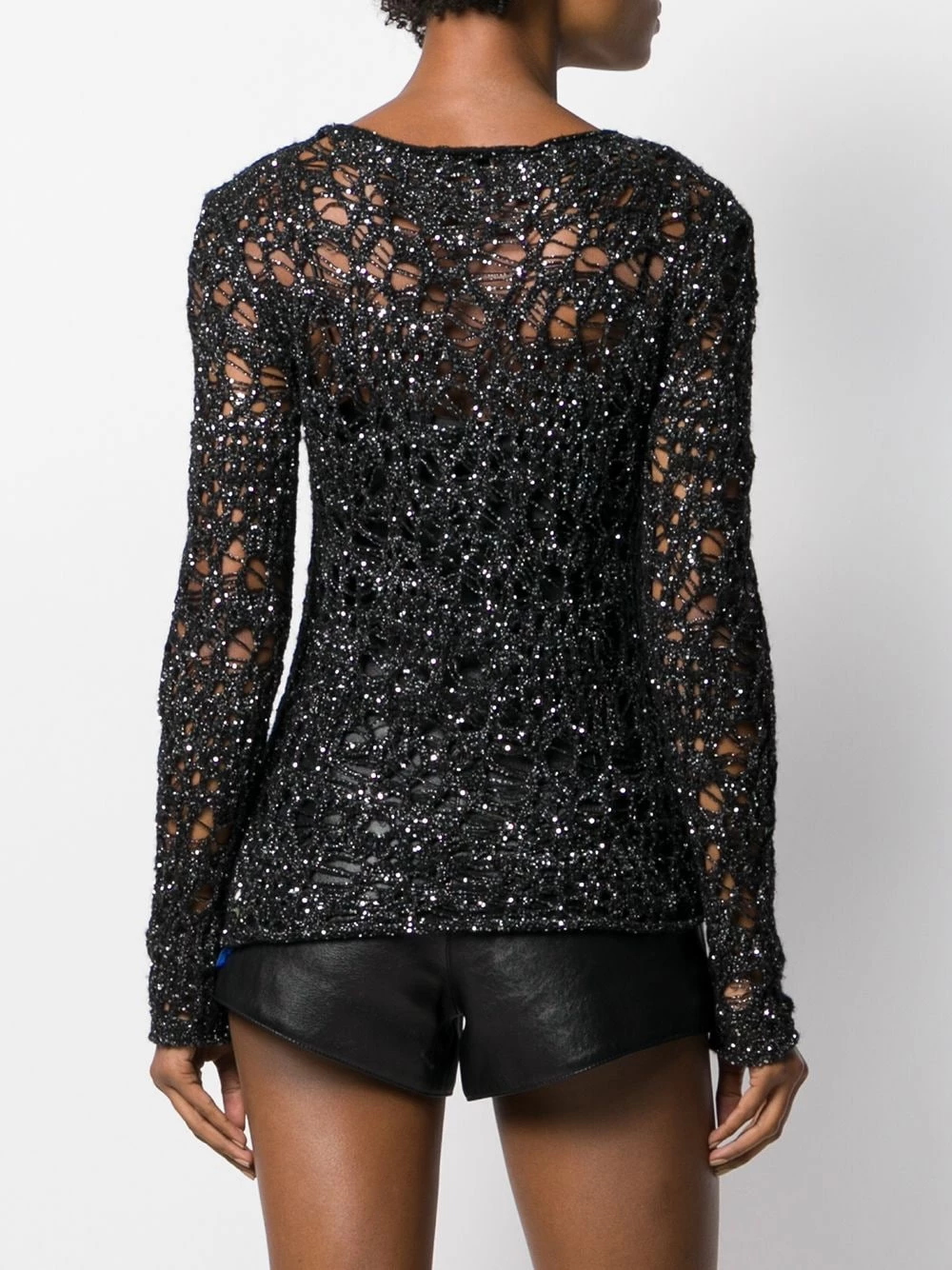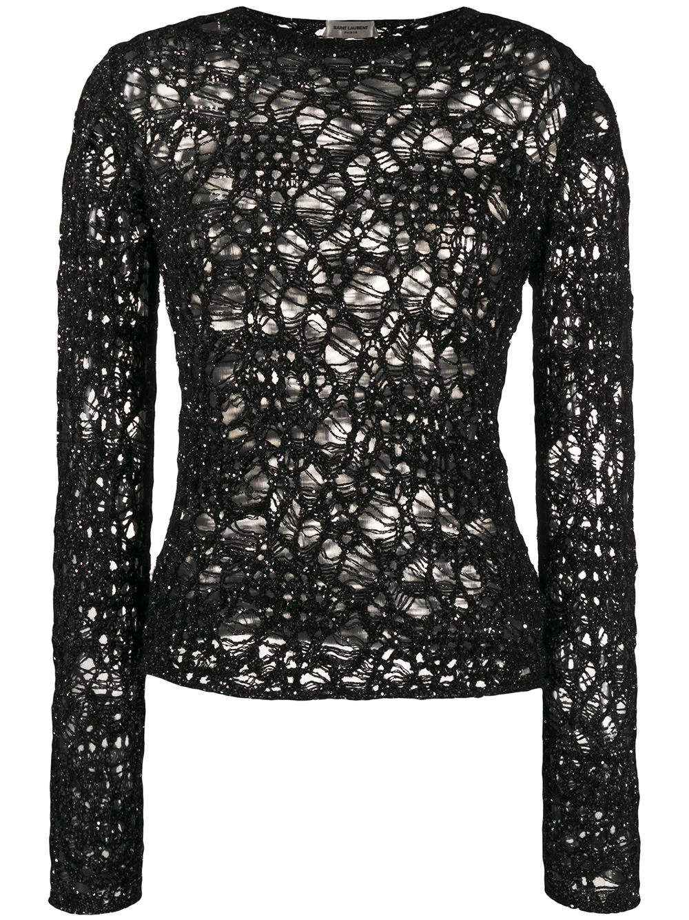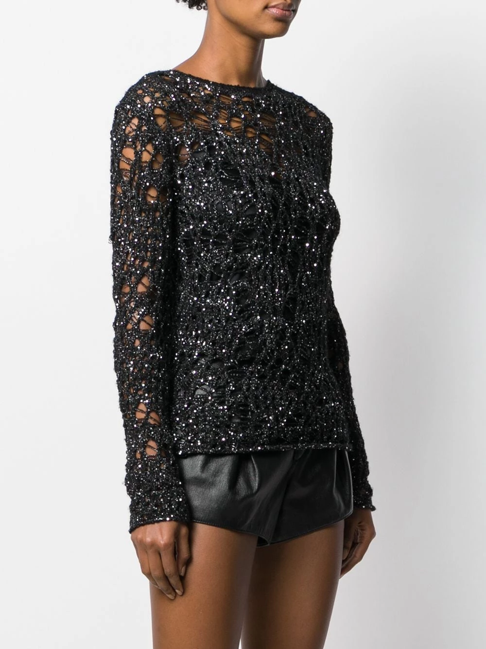 Peek-a-boo! This black wool holey crochet jumper from Saint Laurent shows a little bit of skin for a sexy touch. Covered in sequins, it sparkles too! Featuring a round neck, long sleeves and a fitted silhouette.