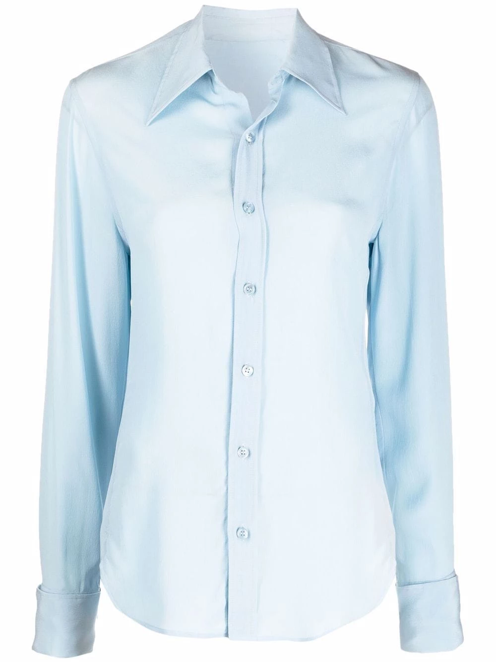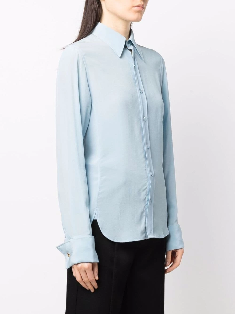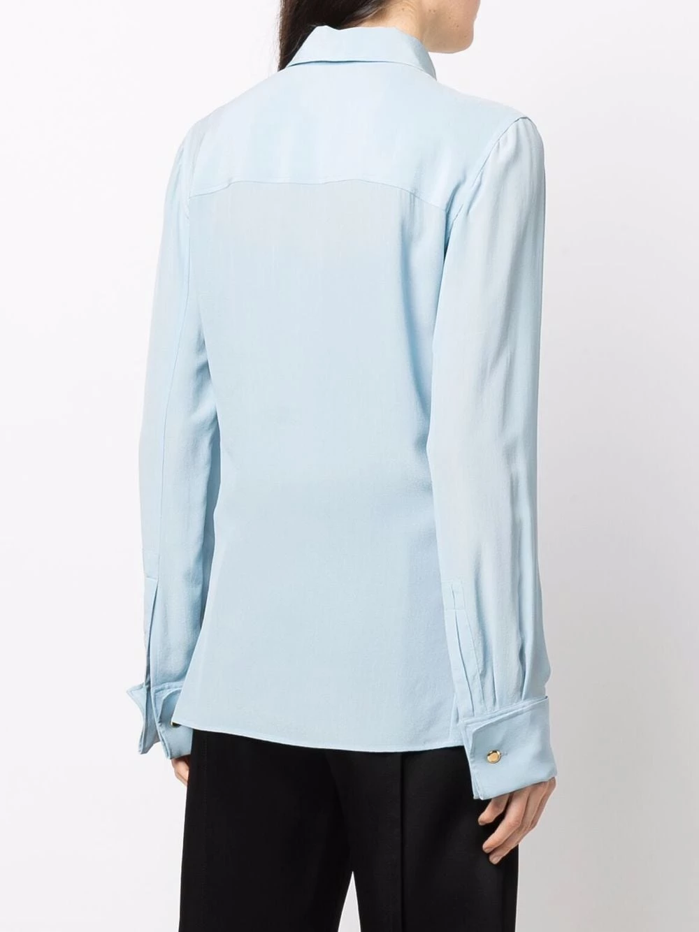 Made entirely from light blue silk, Saint Laurent’s button-up shirt is the epitome of elegance with a relaxed flowy silhouette and turn-up buttoned cuffs.