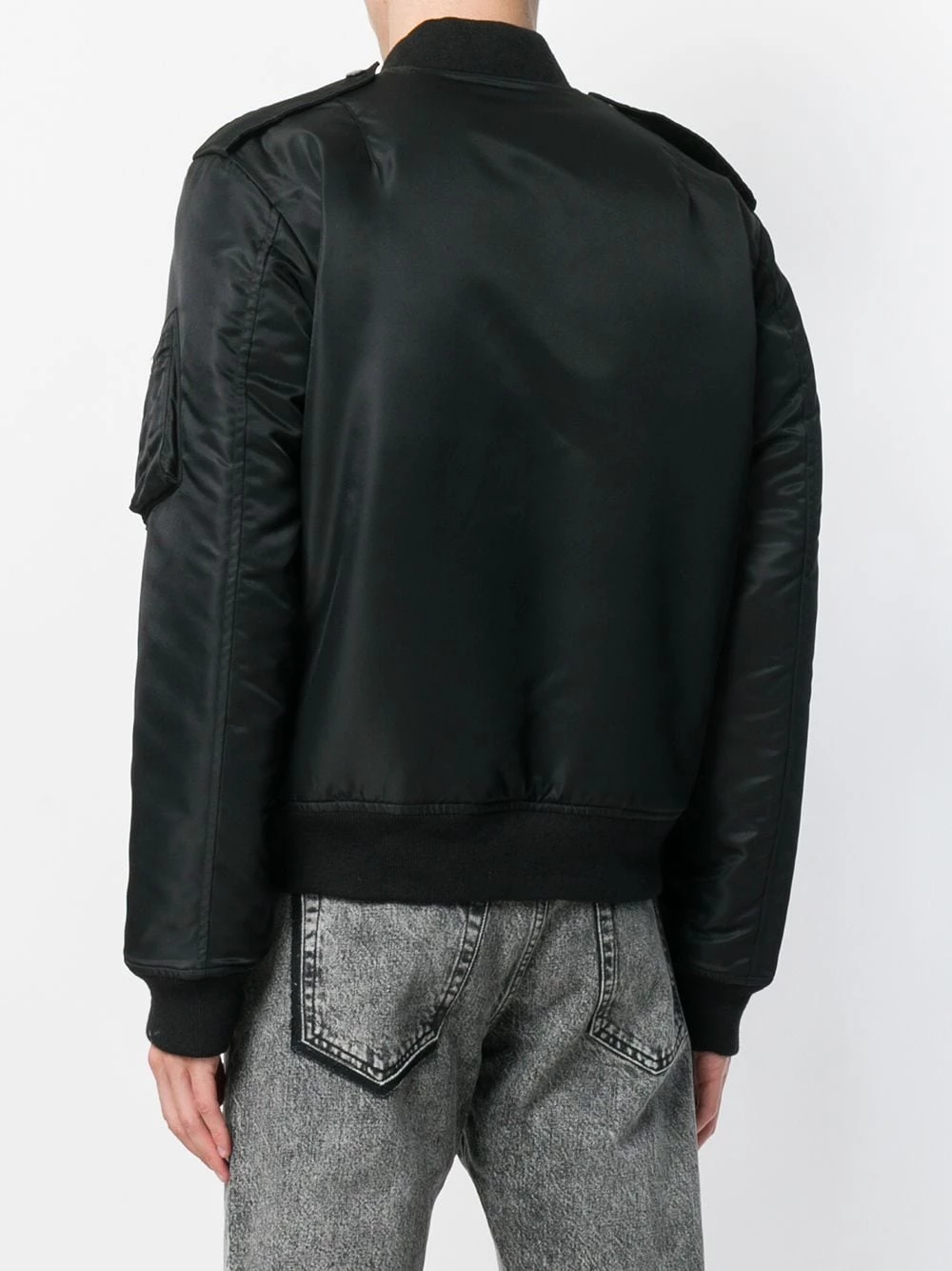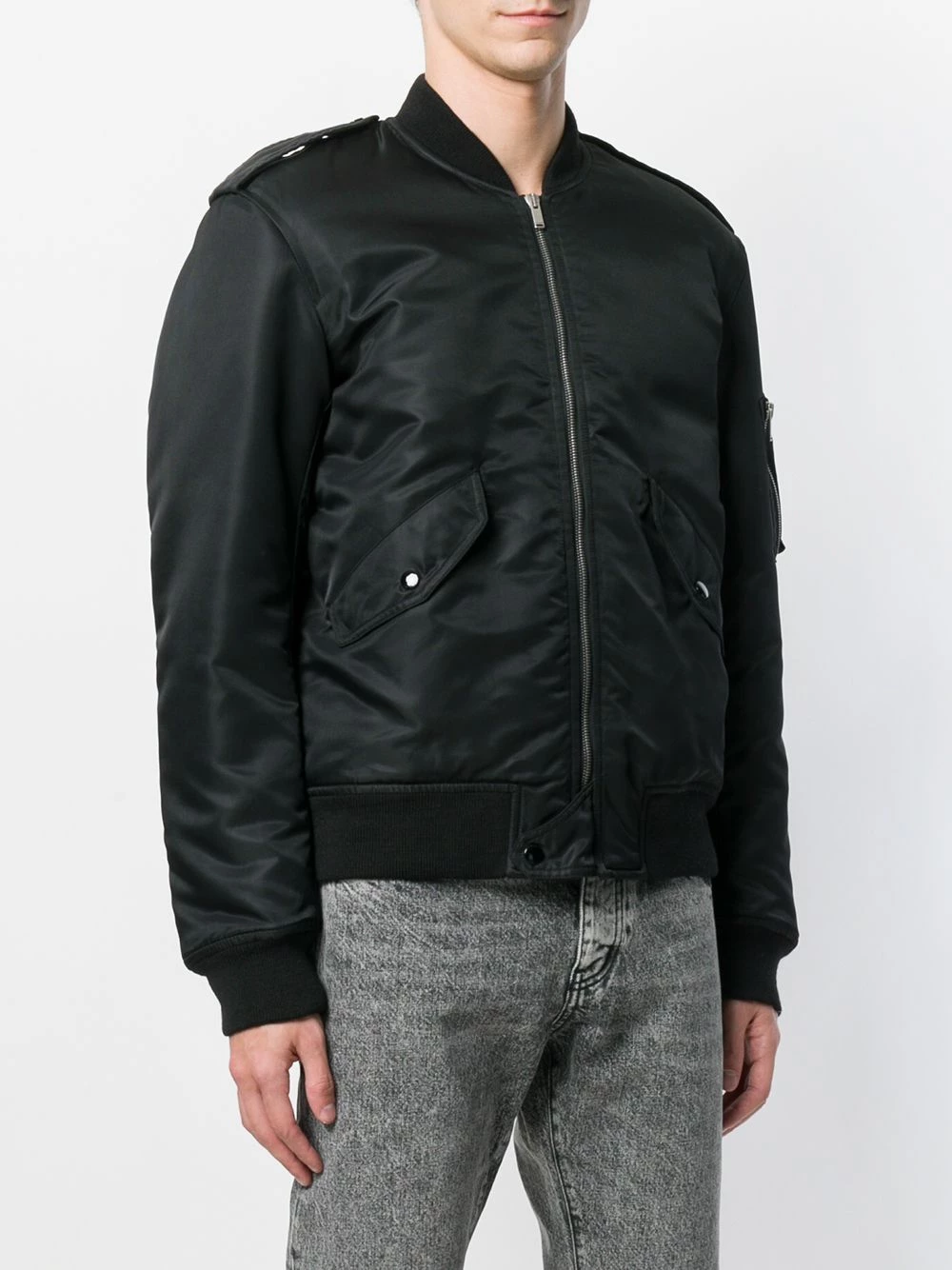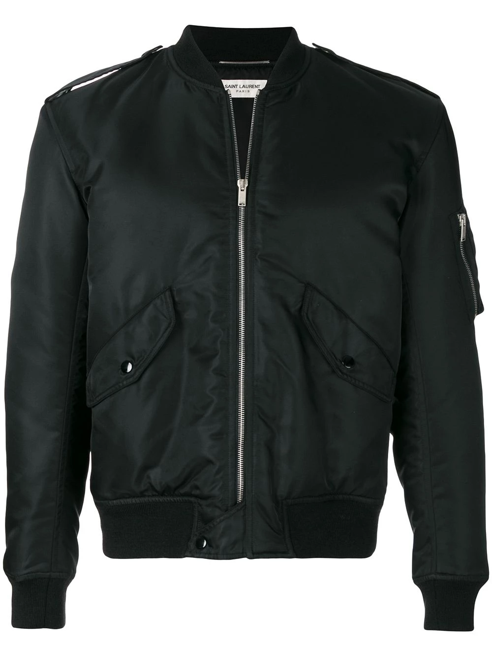 Wanna stay comfortable while looking put-together? Look no further – this black cotton padded bomber jacket from Saint Laurent is here for you. We are weekend-ready and so will you be now. Featuring a ribbed stand up collar, epaulettes on the shoulders, long sleeves, a ribbed hem and cuffs, a front zip fastening, front flap pockets and a padded interior.