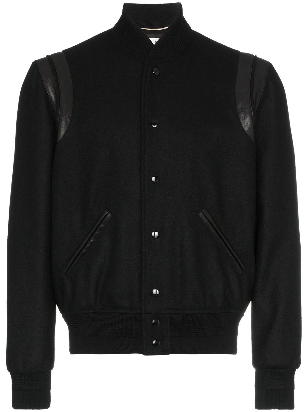 Your college days may be over but a college look will never go out of style. Especially when it’s as effortlessly cool as this paneled-trim varsity jacket from Saint Laurent. Pick the winning fashion team. Featuring a ribbed stand up collar, a front button fastening, long sleeves, side slit pockets, a ribbed hem and cuffs and leather trimming on the shoulders and pockets.