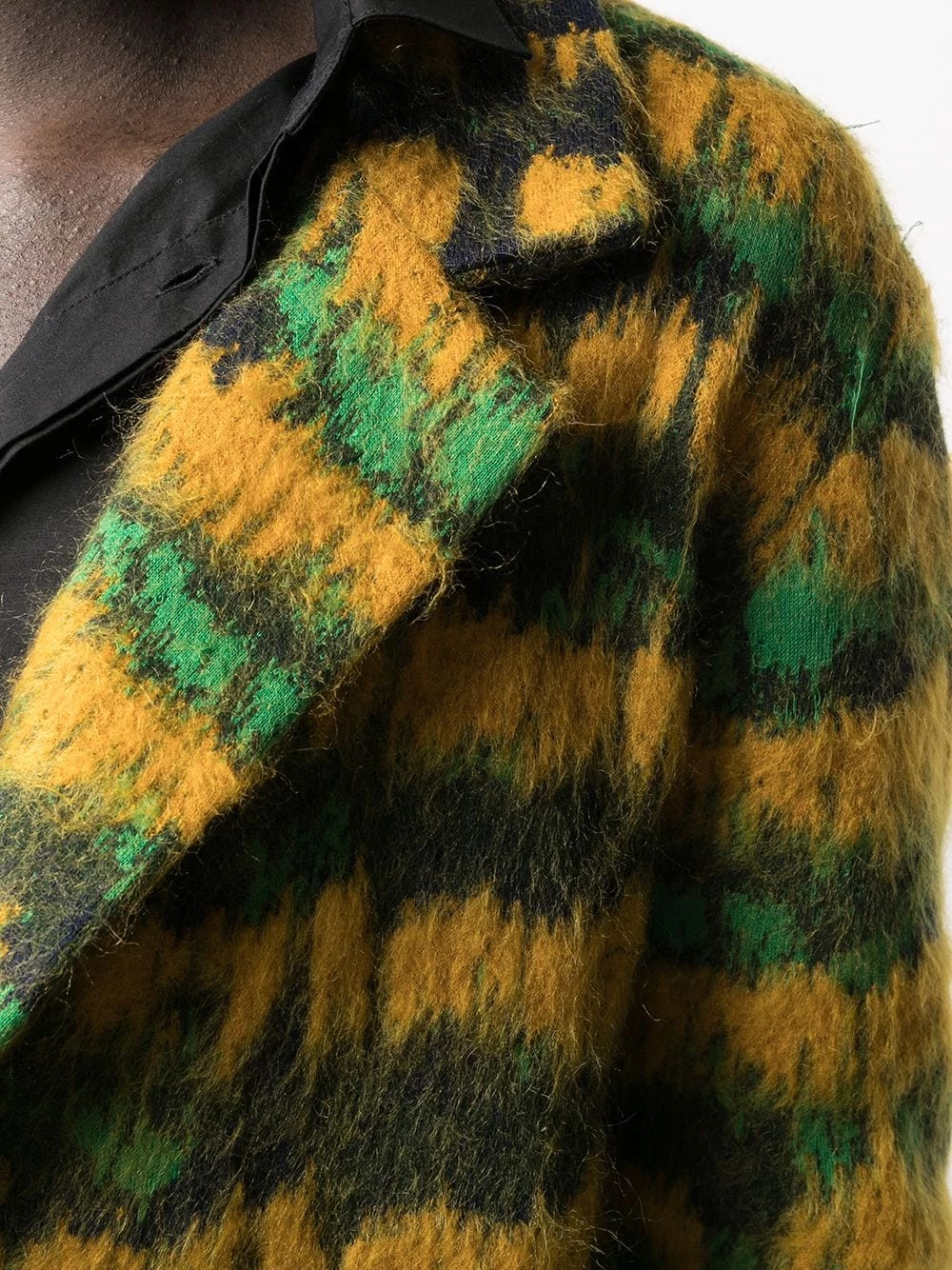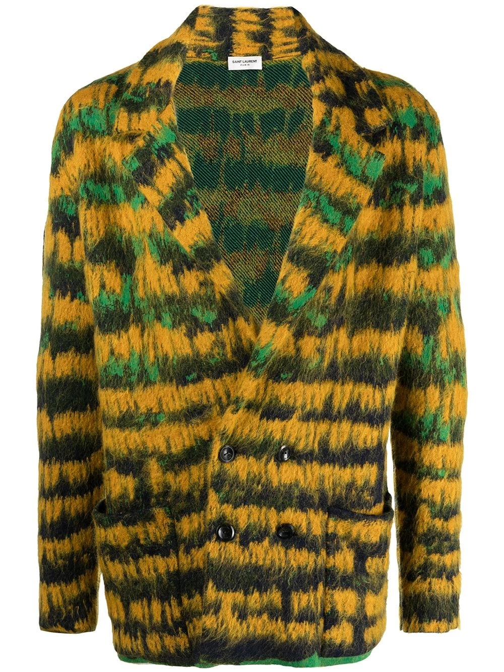 Not like your usual knitwear, not like your usual blazers. Saint Laurent puts a spin on tailoring with this knitted jacquard-woven double-breasted blazer, which has an abstract feathered effect. Get the best of both worlds.