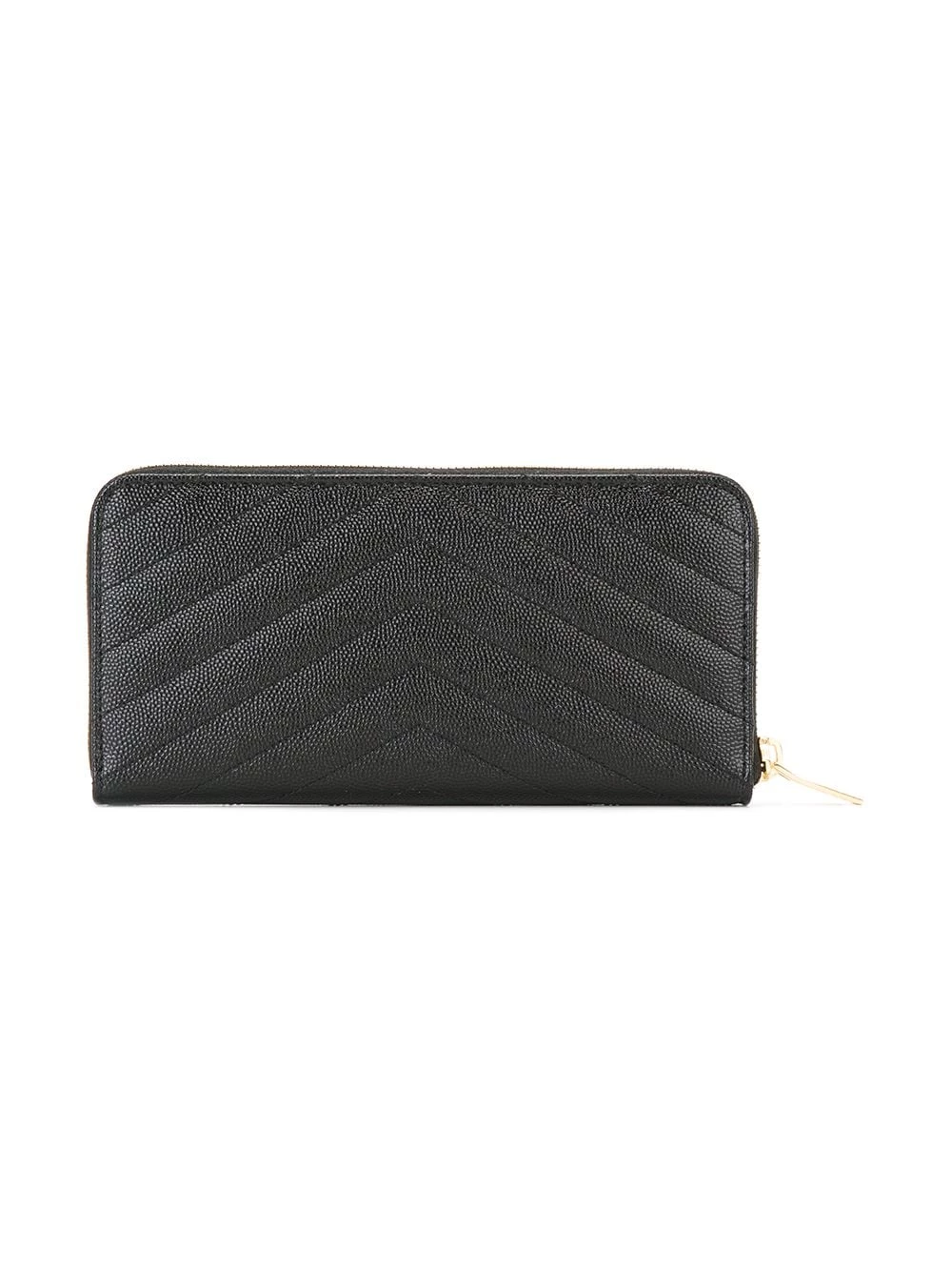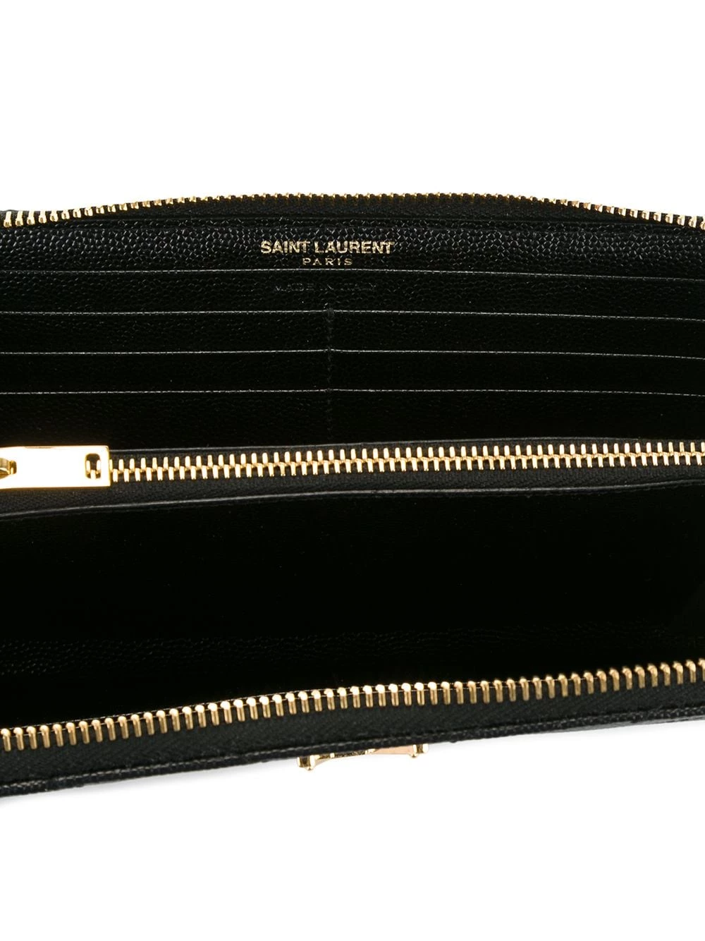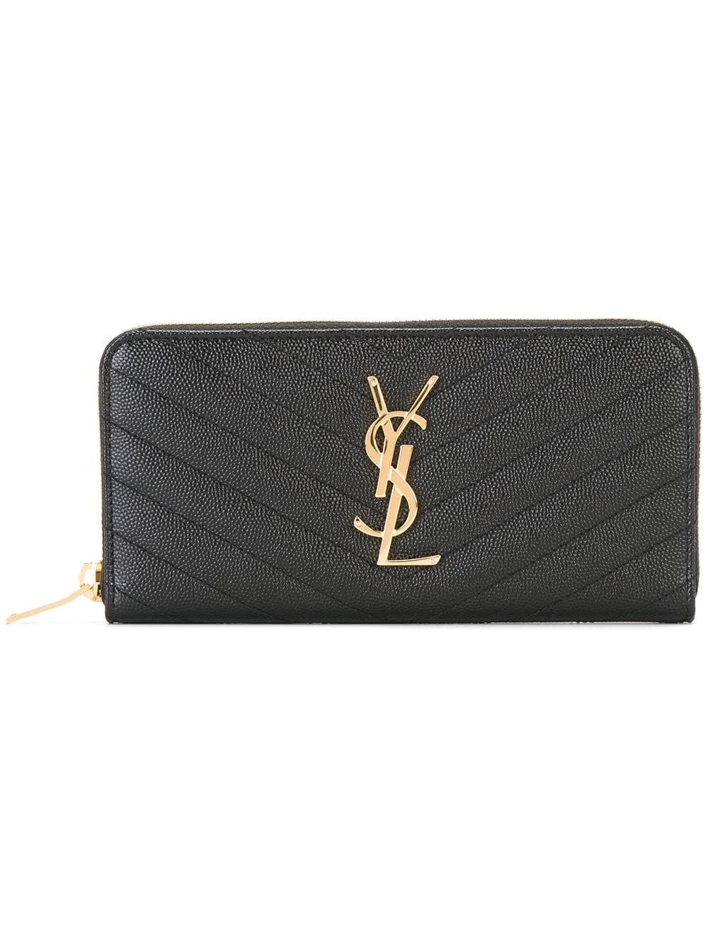 Are you the annoying one in the coffee queue who is always rummaging around in their pockets when it’s time to pay? Keep all your plastic safely stored in this black matelassé calf leather Monogram zip around wallet from Saint Laurent that looks elegant and also prevents the baristas from rolling their eyes at you. Featuring a front logo plaque, gold-tone hardware, an all around zip fastening, an internal logo stamp, an interior zipped compartment, multiple interior card slots, two note compartments and two receipt slots.
